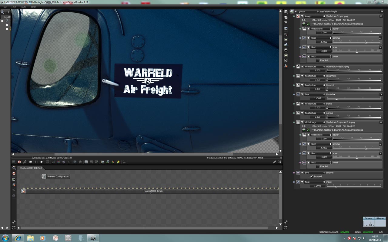 On the example below, the white sticker "WARFIELD Air Freight" on the helicopter has transparent background (png). It is not mapped on the hull of the helicopter, but instead like a real sticker : Mapped on a slightly curved plane matching perfectly the surface and placed just 0.4 mm over the surface of the hull.