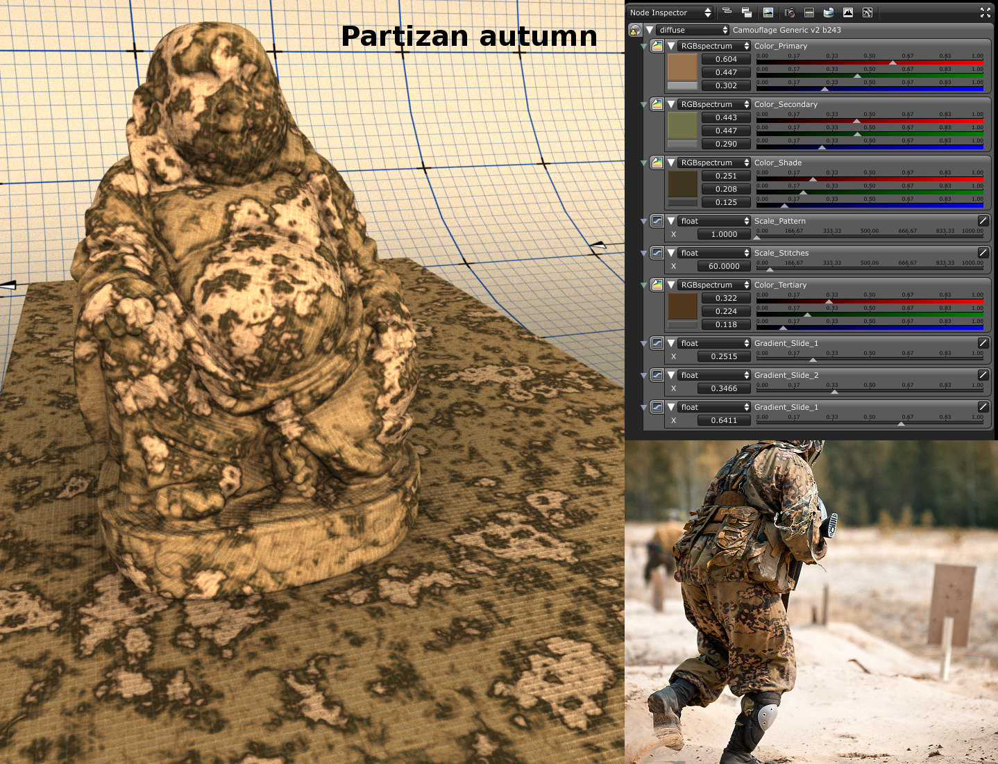 I was able to satisfactory mimic two real camo patterns: IDEA -> Implement a system that will allow the creator or users to upload presets for some material, ie. different variations of input parameters for some macro. You could then choose this presets from a dropdown.
