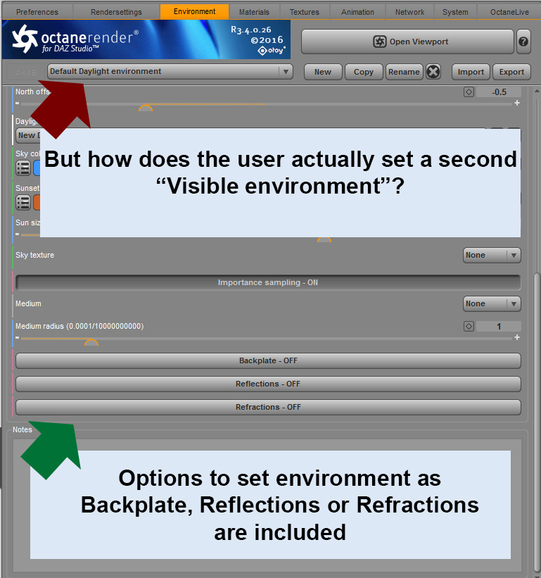 The current architecture of the DAZStudio plugin does not make this easy to do. And even if it were possible - there would be a lot of added complications to how New/Copy/Rename/Import/Export work (would they do just the Environment, or either the Environment or Visible Environment, or both?). The DAZStudio plugin might handle have both an Environment and Visible Environment panel in the Environment tab, but would potentially not handle having the Visible Environment disconnected (ie. no visible environment). So in summary, it's probably possible to implement, but a lot of work. I will investigate further in the next week or two.I imagined in OcDS there would be a second pull down menu below the default environment settings for the secondary "Visible environment".