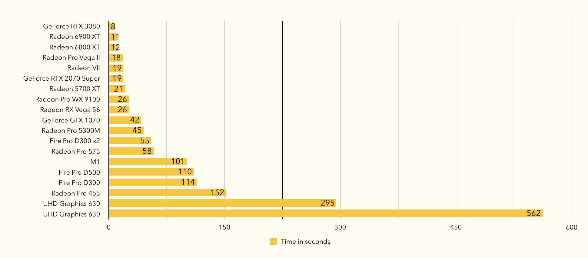 So I just ran a test using a RTX 3080 and got 8 seconds (same time regardless of RT acceleration being turned on or not). Using Network rendering with an additional 3 GPUs (2 1080 ti's and 1 1070 ti) halved that to 4 seconds.