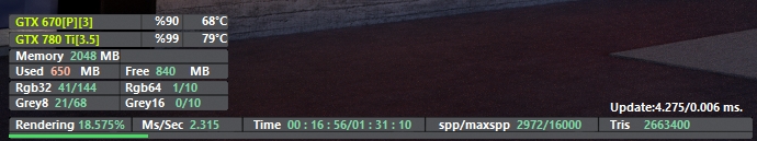 I have got a second graphics card that provides 3 GB VR and run it together with my first one that comes with 2 GB.
