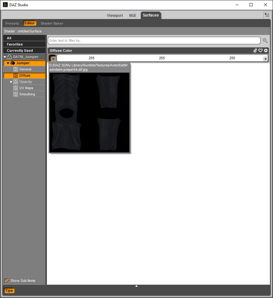 I am attaching the material screenshot for the DATM_Jumper top. As you can see, it does have a Diffuse node, but as a separate node and not inside the General node.