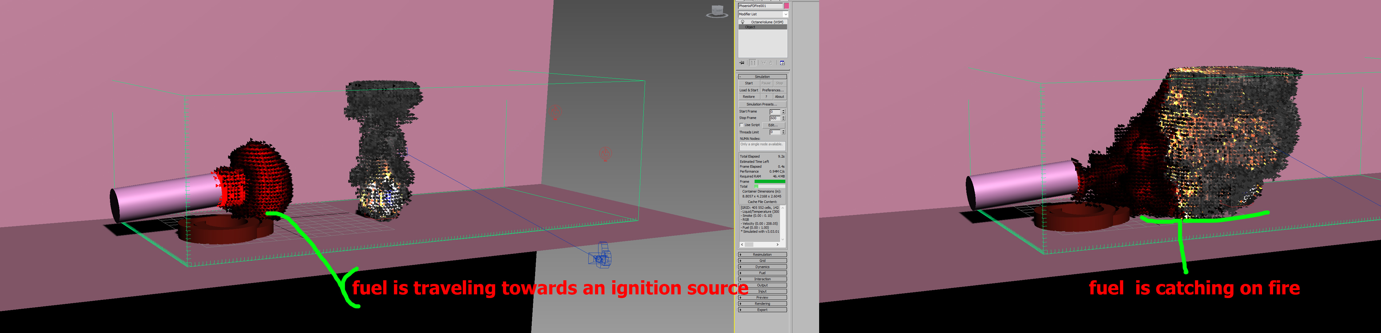 this is the scene. The same one i sent before on the left is the fuel that is coming out before it is lit. If you simulate the scene you will see that the fuel ignites once it touches the fire ball on the right