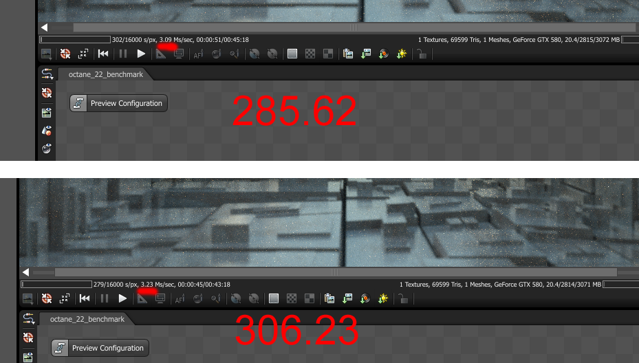 smicha wrote:Here are the scores for GTX 580 3GB with 306.23 and 285.62 drivers - about 4.5% speedup.