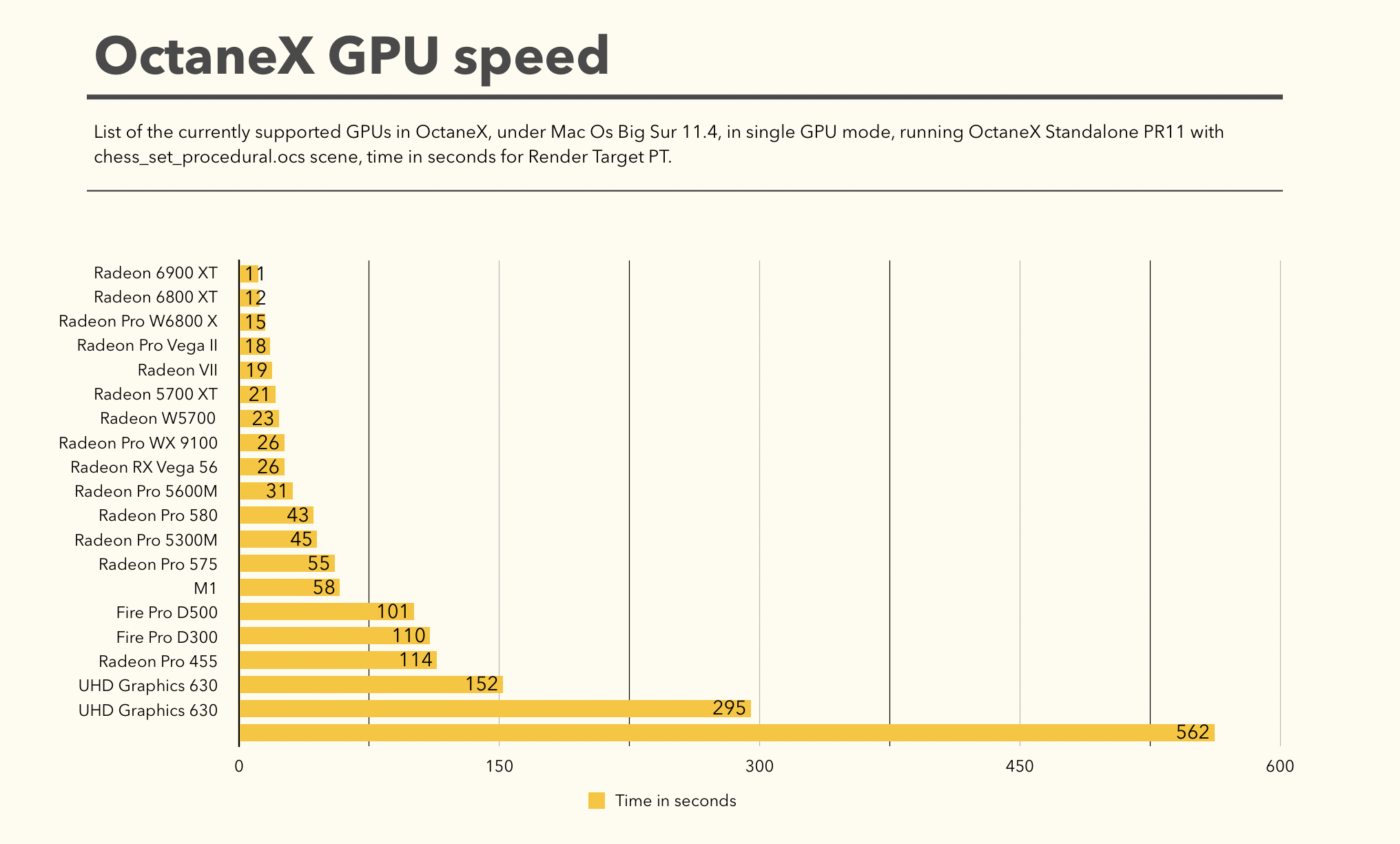 About eGPU, you can add one of the supported AMD GPUs in an eGPU box connected via Thunderbolt 3, here is a graph of speed in Standalone OctaneX under 11.4: