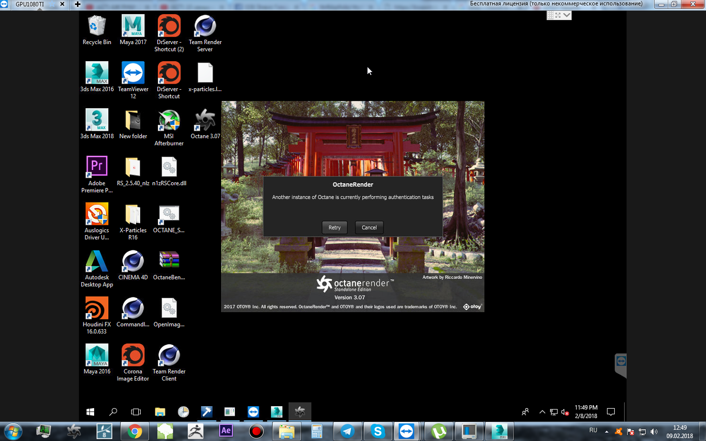 The error Another instance of Octane is currently performing authentication tasks is shown when there is more than one instance of Octane running and performing license activation / deactivation. If you receive this error, ensure that only one instance of OctaneRender Standalone, Octane plugin, or OctaneRender Slave Daemon is running on the machine. In rare cases the lock used to detect this state may become invalid due to a crash or invalid state in the Octane plugin application. If this is the case, you may need to sign-out or restart before you will be able to release licenses.