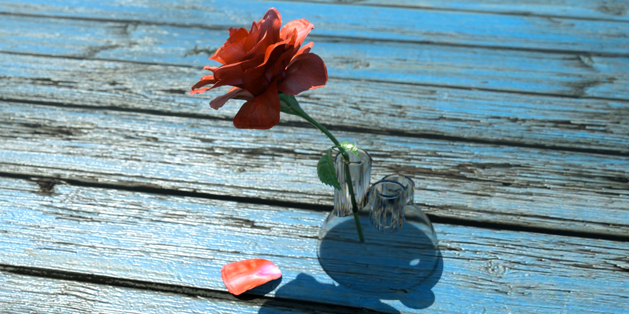 the rose should have a diffuse material + 0.25 of transmittance + 0.5 of scattering light + 0.2 of absorb + 0.2 of glossiness (mix)