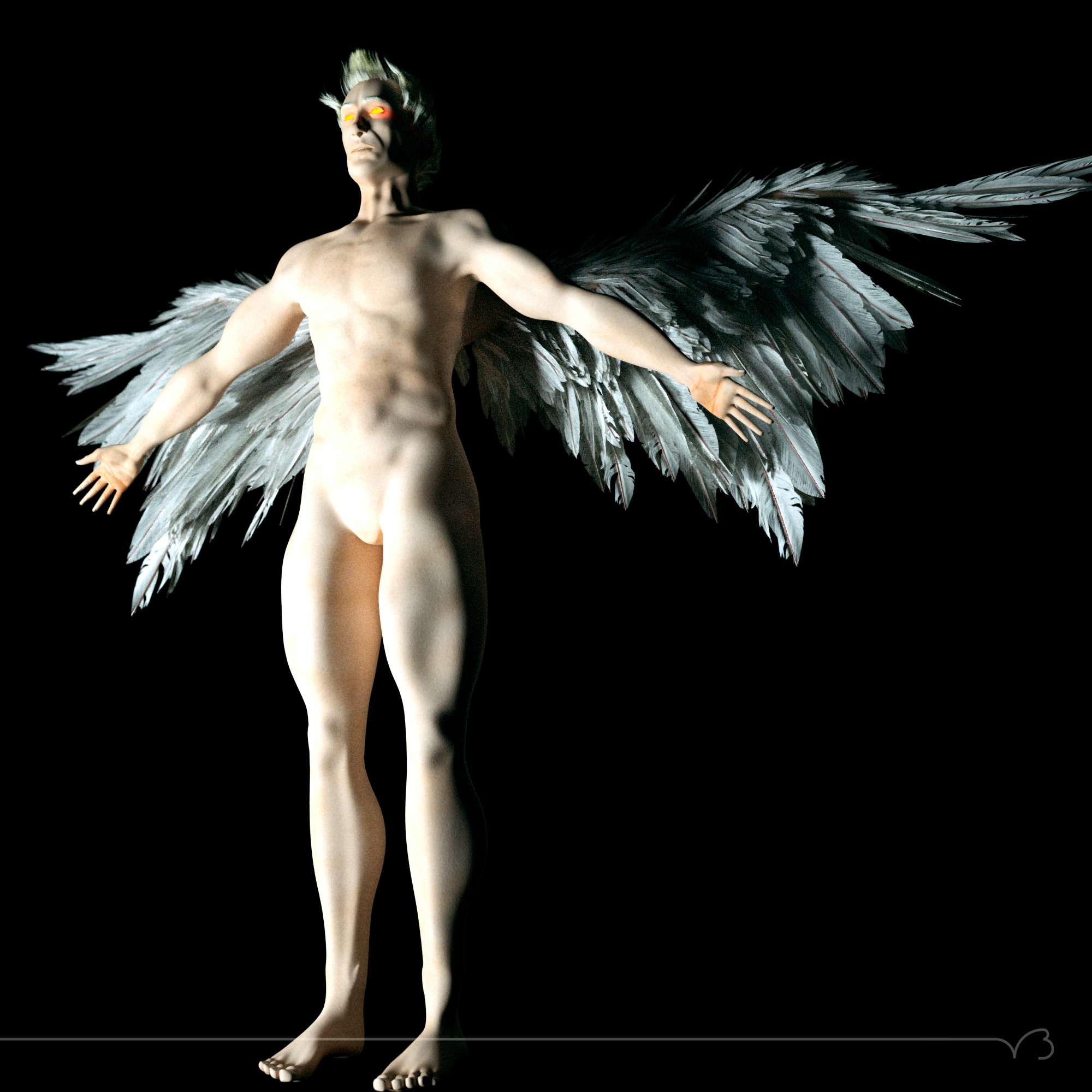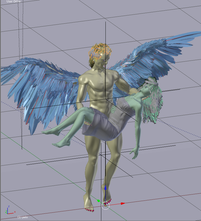 Well, this is my latest entry for the contest, it's done from scratch in blender, with no reference photos (hence there might be some proportion mistakes), after I had everything modeled, I did some minor retouching in sculptris of the base mesh, but really minor. I was really pleased at how easy was to do it in blender. I did watch quite some video tutorials thou, mainly about modeling, and even thou they were about blender, they were more about topology and general modeling. This is the first model I've done from scratch with a polygon modeling technique, usually I go the other way, sculptris and then retopo. This was lots of fun. For the wings I modeled a single feather, did 6 copies and made some variations, and then I used hair particles to distribute them according to some anatomycal schemes I found. The fallen god's texture was hand painted in sculptris previous unwrapp in blender. I know I could have used blender's modeling tools, but I rather like more sculptris for those things.
