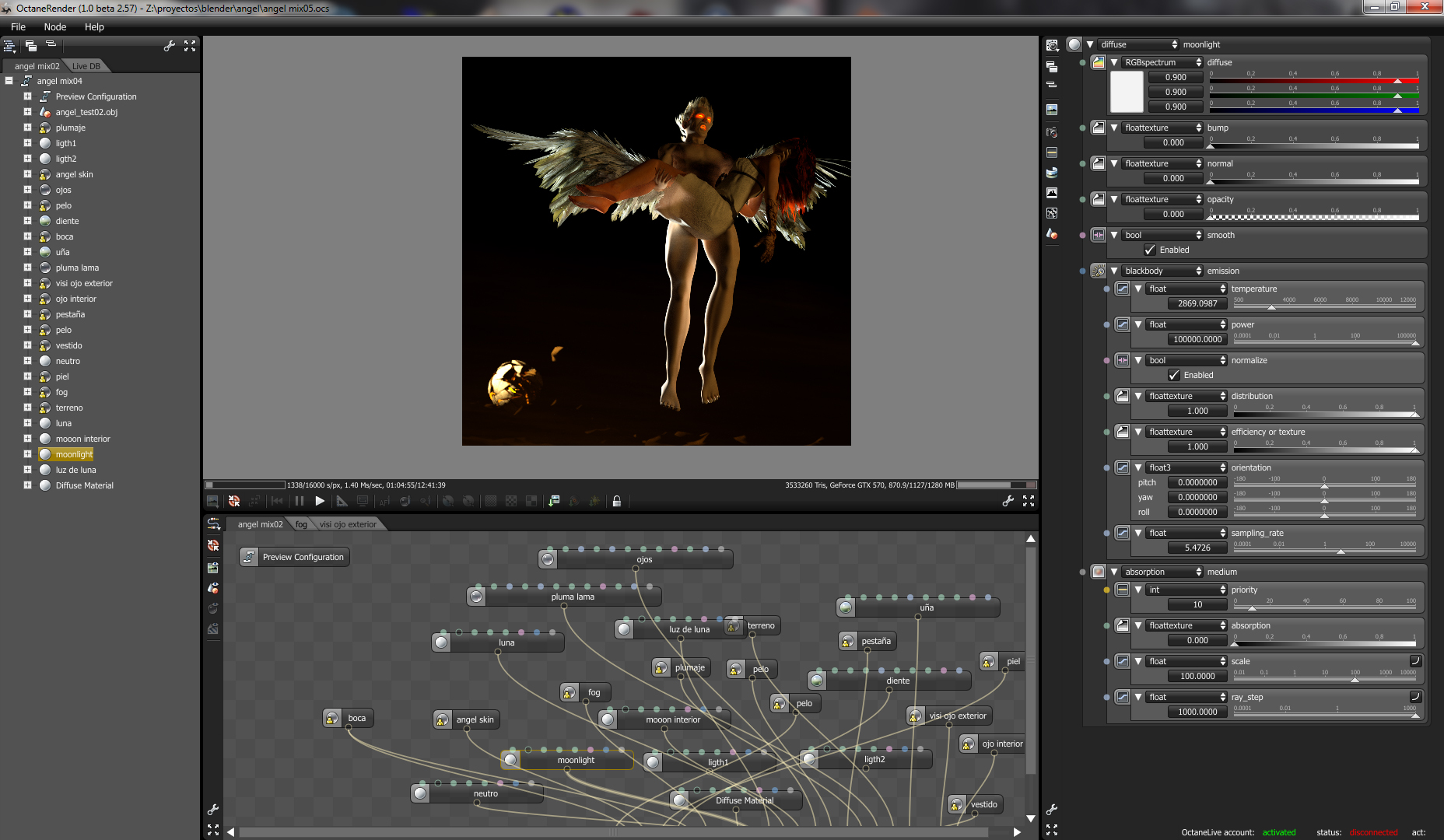 One of the things I was after is trying to do a background adding to the mood but not distracting. I didn't wanted to use a picture, no particular reason, just wanted to be something I modeled. So I created some simple mountains with the blender's landscape generator, added my moon (blender version), and a plane to create the fog-depth effect with a specular material with a medium scatering node and emission, all controled with a turbulence generator to create fake clouds. I added the girl from my previous entry, which is a sculptris-max-blender mix, and setup the whole scene after rigging the angel. The wings could have done with better rigging but time was not on my side, so a simple thing would do.
