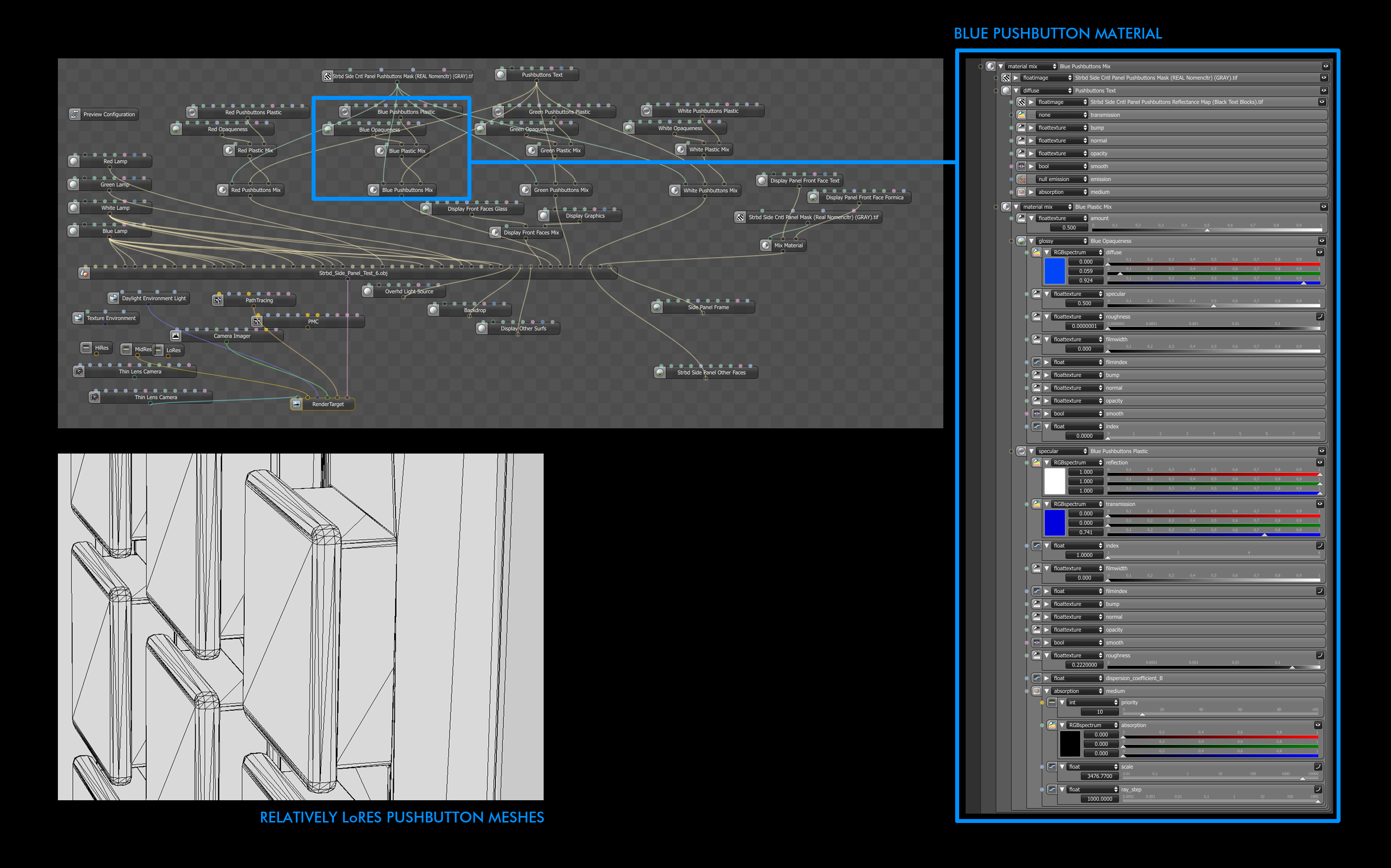 One item of note...I used a material mix to get the unlit button color to be fairly intense. This was only done when I was still working with a subsurface scattering approach, because subsurface would not allow me to get a really bright colored plastic texture. Since I have since nixed the subsurface idea completely, I MIGHT be able to dump that extra "layer".