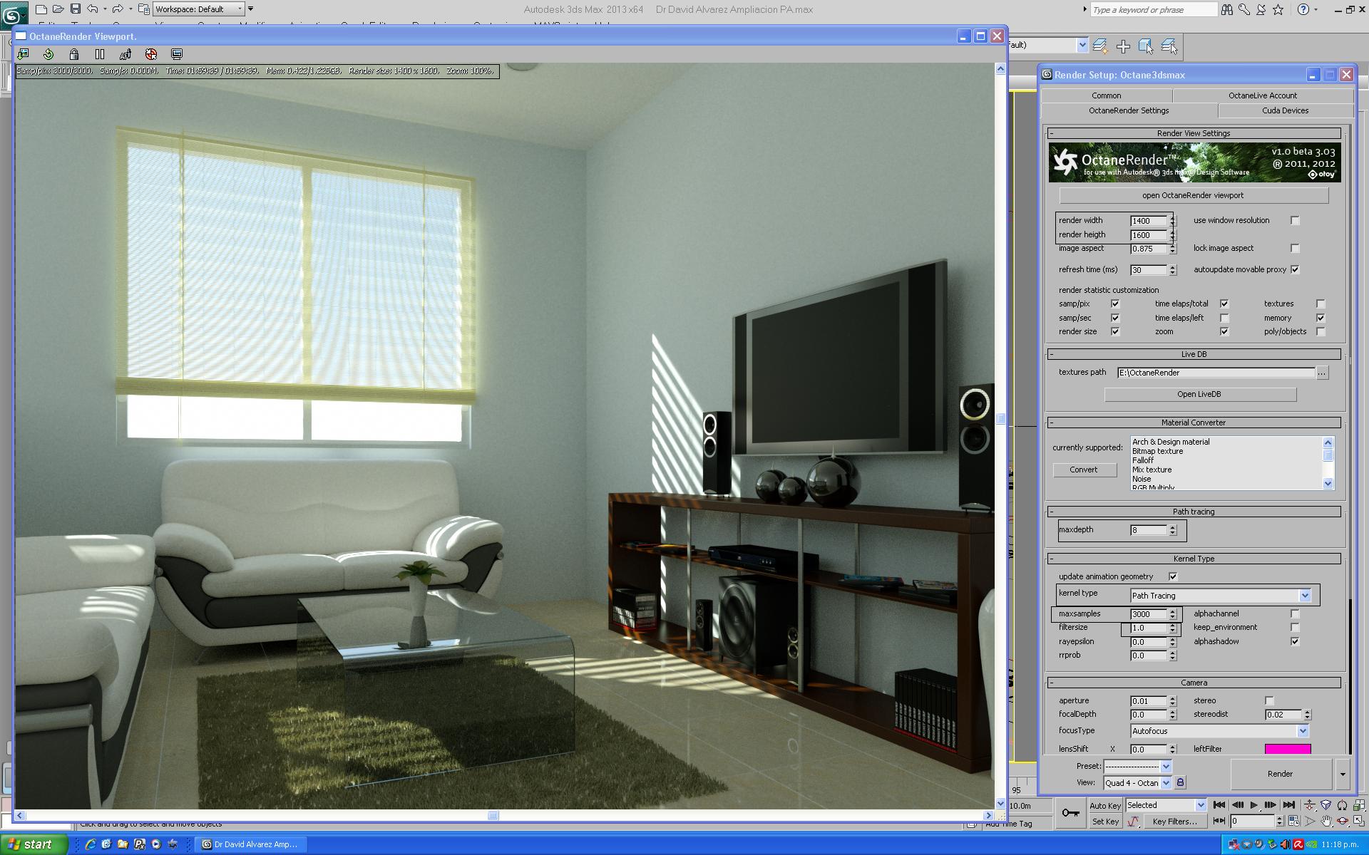 dejo una imagen de un espacio diseñado y ampliado, sala de tv, planta alta, tamaño de imagen de 1400 x 1600 px, kernel pathtracing, maxdepth 8, maxsamples 3000, tiempo de render de 1 hora, 59 minutos, 39 segundos, adjunto imagen de seteo