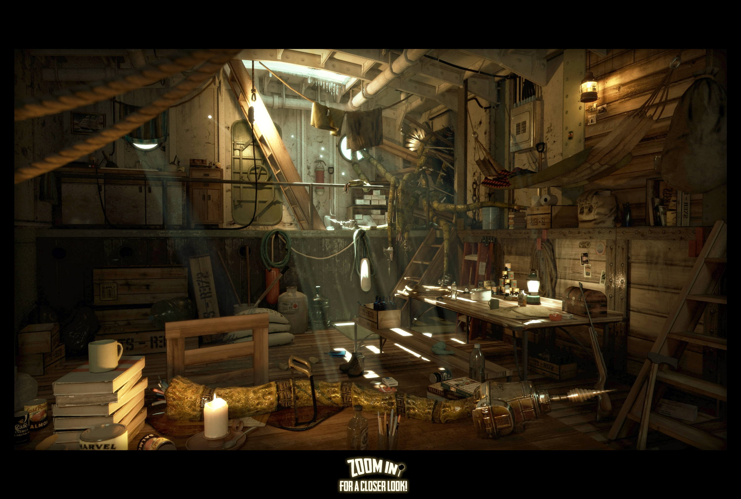 I agree the cup needs more tessellation, and I really appreciate the comments as I plan to re-render this in the near future based on recommendations, I also agree about the chair, could be a lot more interesting! I also plan to re-arrange the scene so its not so overwhelming to the eye and has more focus on the cool stuff like the monster/drone. I need to re-work the lighting as well, and possibly ditch the Shop Light.
