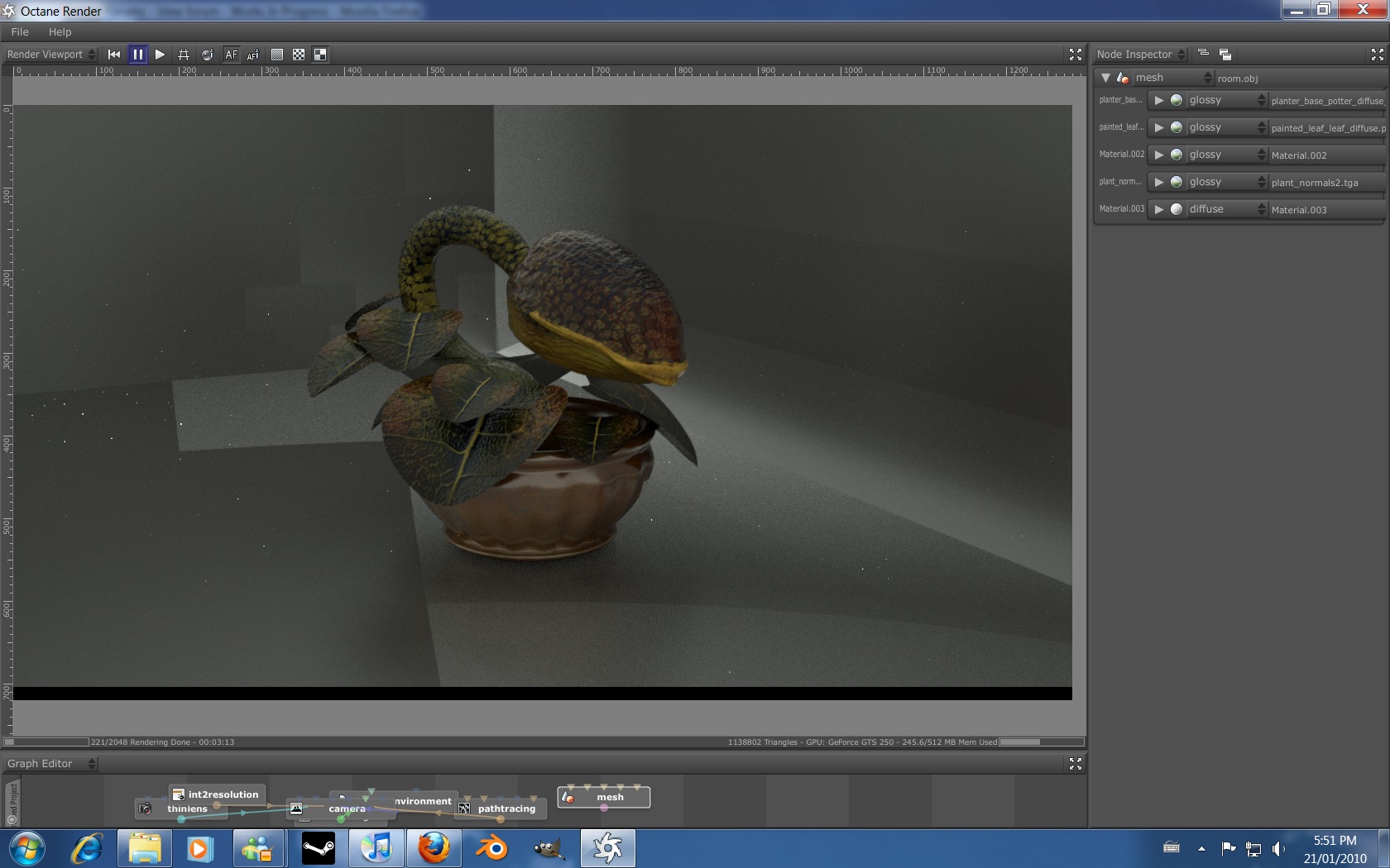 3) There are weird glitches all over the place. For instance, whenever I adjust a slider somewhere in the Node Inspector, it kicks me back up to the very top. So, I could be changing the specularity in the 15th mesh at the very bottom of the Node Inspector, and immediately after making the change, Octane throws me back up the top of the Inspector again.... Coupled with the slowdown mentioned in 1), it makes it incredibly slow to tweak the scene. This is analogous to Microsoft Word kicking you back up to the 1st page of a 10 page document anytime you add a sentence... you just can't get any work done that way.