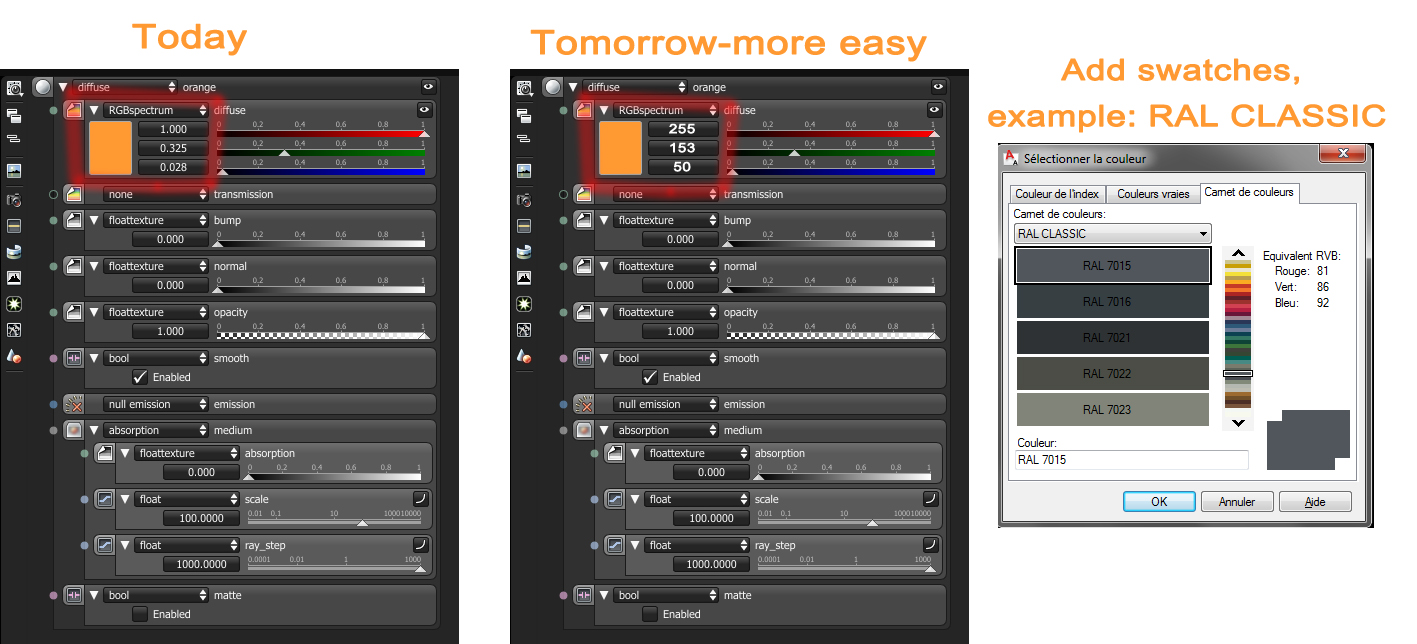 octane - in theory - has the capability to render them much more closely to their real world appearance, if only there was some easy way to calculate the numbers. i once found a page that somehow does such a calculation: http://www.brucelindbloom.com/index.htm ... cHelp.html - it allows you to input the lab color codes of a RAL color, but i never found out what conversion settings would be needed to get the correct decimal rgb representation out of it...