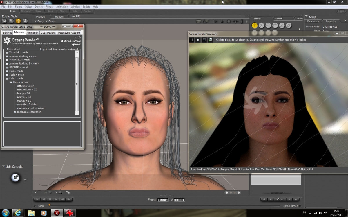 It seems that octane doesn't render very well the poser dynamic hair (mesh problem, slow render ect...)