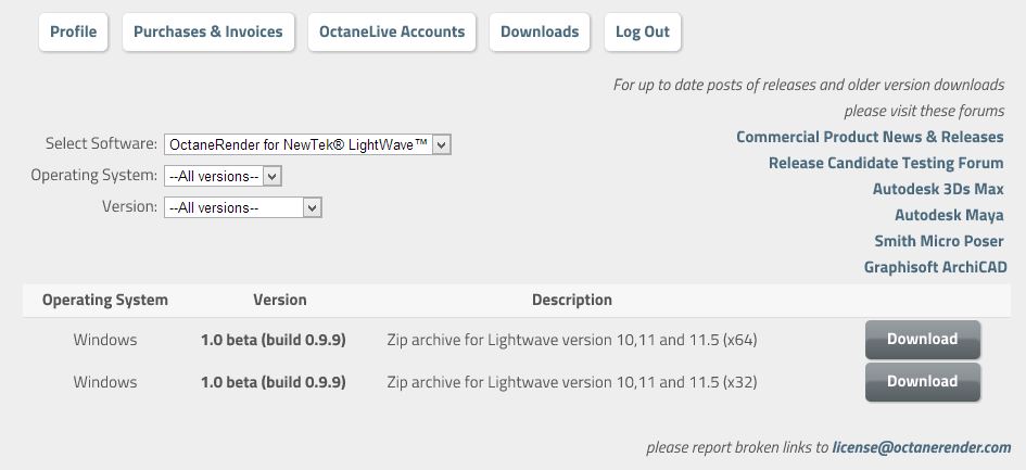 As soon as your purchase is processed and the license is available and showing in the "OctaneLive Accounts" page (it can take up to 20min for your purchase to be processed), you should be able to either click on the "download installation files here" link on that page, or click the Downloads button in the customer area and select lightwave from the drop down list.