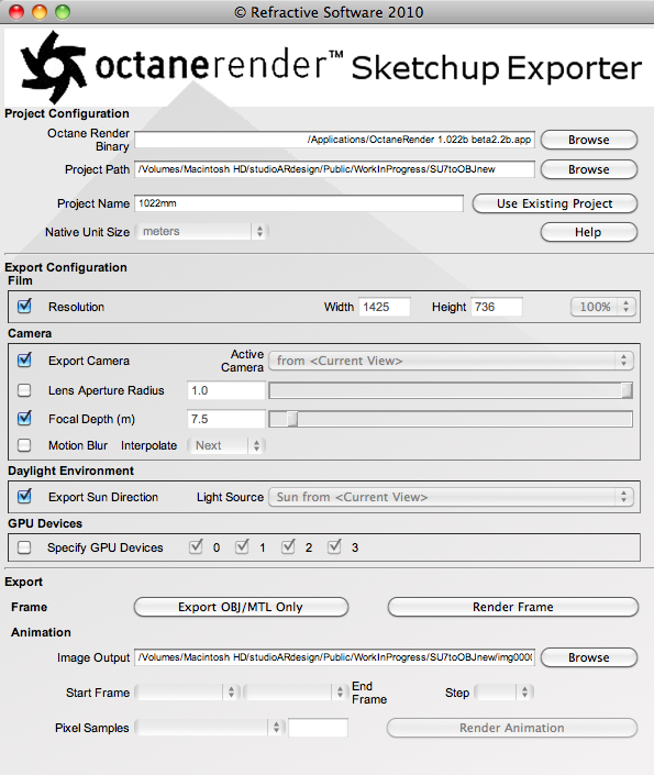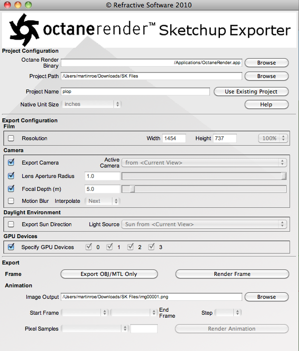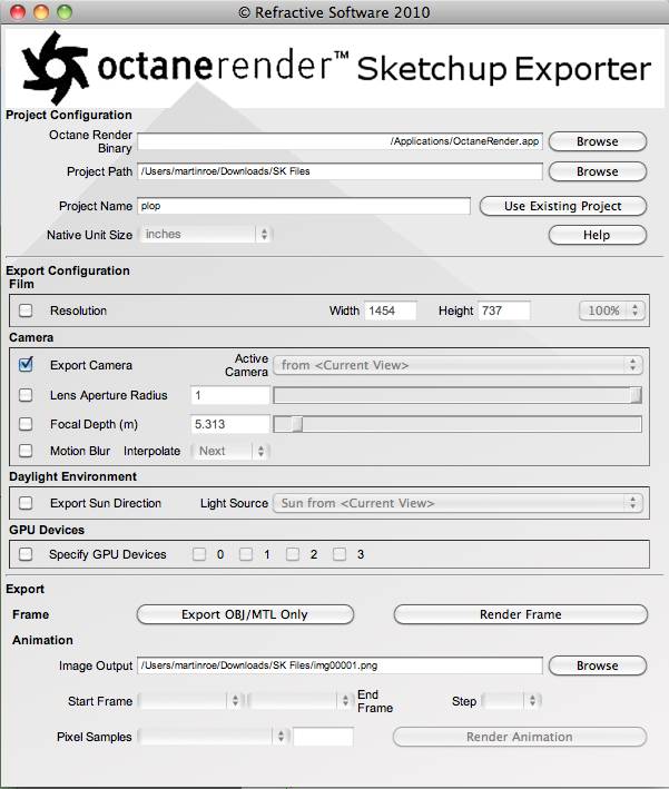 Additional render-animation option added - you can now animate just the camera [default setting based on the settings of the first frame, used for walkthroughs, flythroughs, orbits etc], OR you can animate the camera AND also animate objects/visibility/layers/etc [for SketchyPhysics/Animator etc] - the second option is much slower to process because it requires multiple OBJ/MTL files to be made - but then it does allow you to make animations of the camera AND objects.