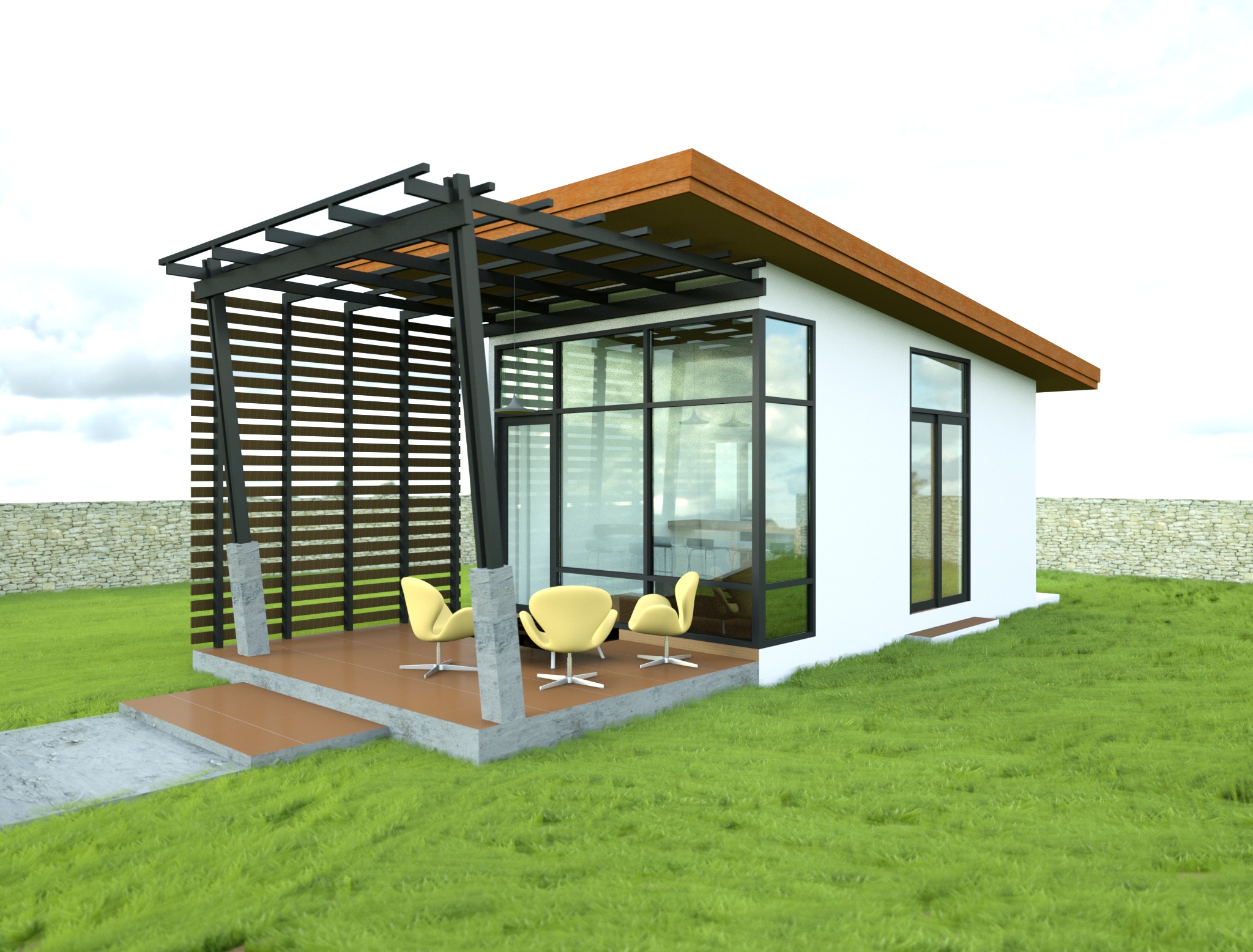 2. I actually like the colour of the frames / structure. Perhaps this is a design consideration. HOwever I find your timber facia to be the wrong colour in the sheme (I would have made this a dark grey / black as well in keeping with the scheme);