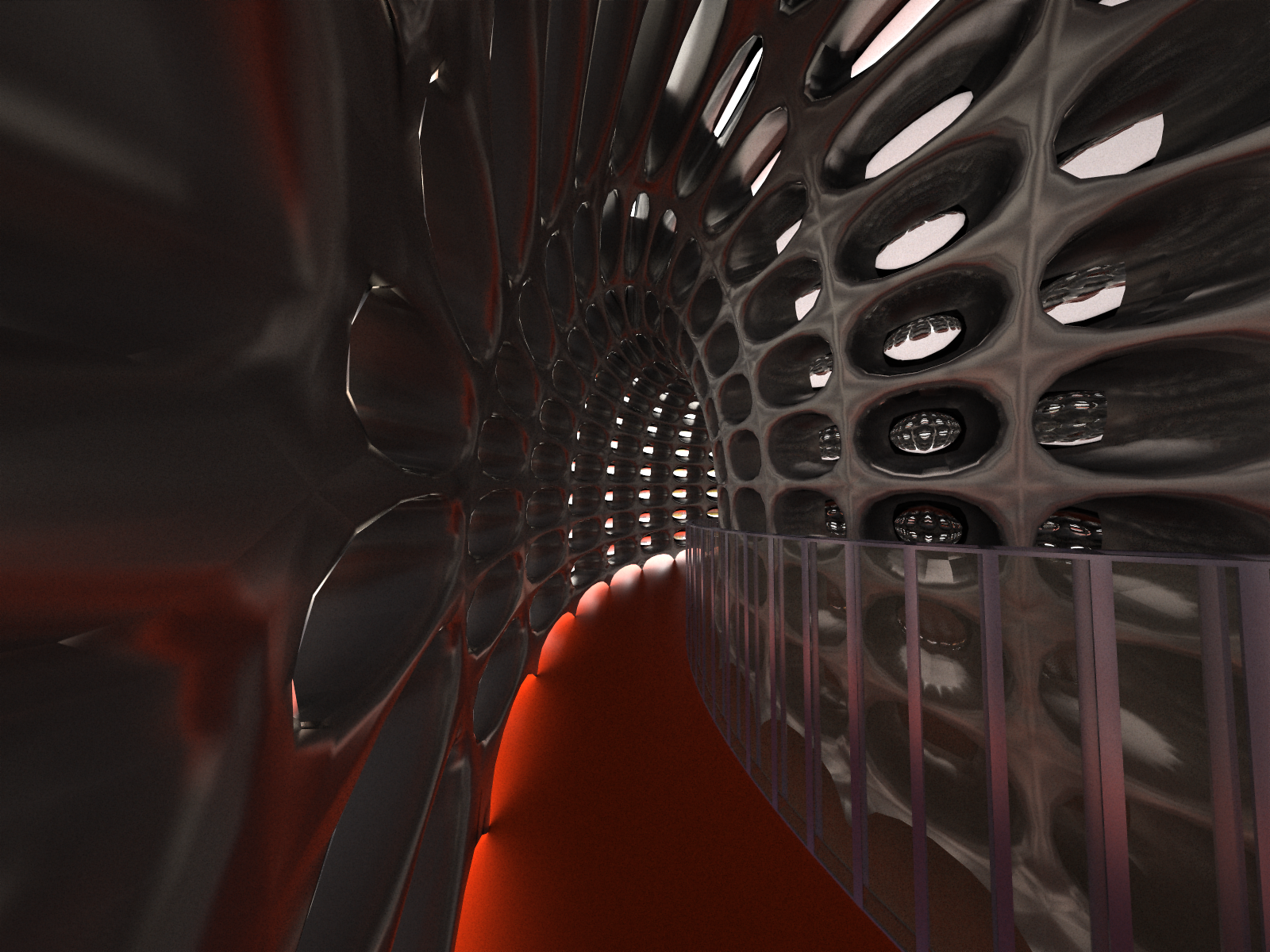 I'm designing an opera house: the attached image shows an interior "cloister"—a circulation space. If I render in modo, the curvature is much smoother because of sub-D capability. I froze and triangulated before exporting to Octane, but the texture on the curved wall is still a bit weird. Also, because of the curved glass (I guess), the render times are pretty long: over 45 minutes for the top one.