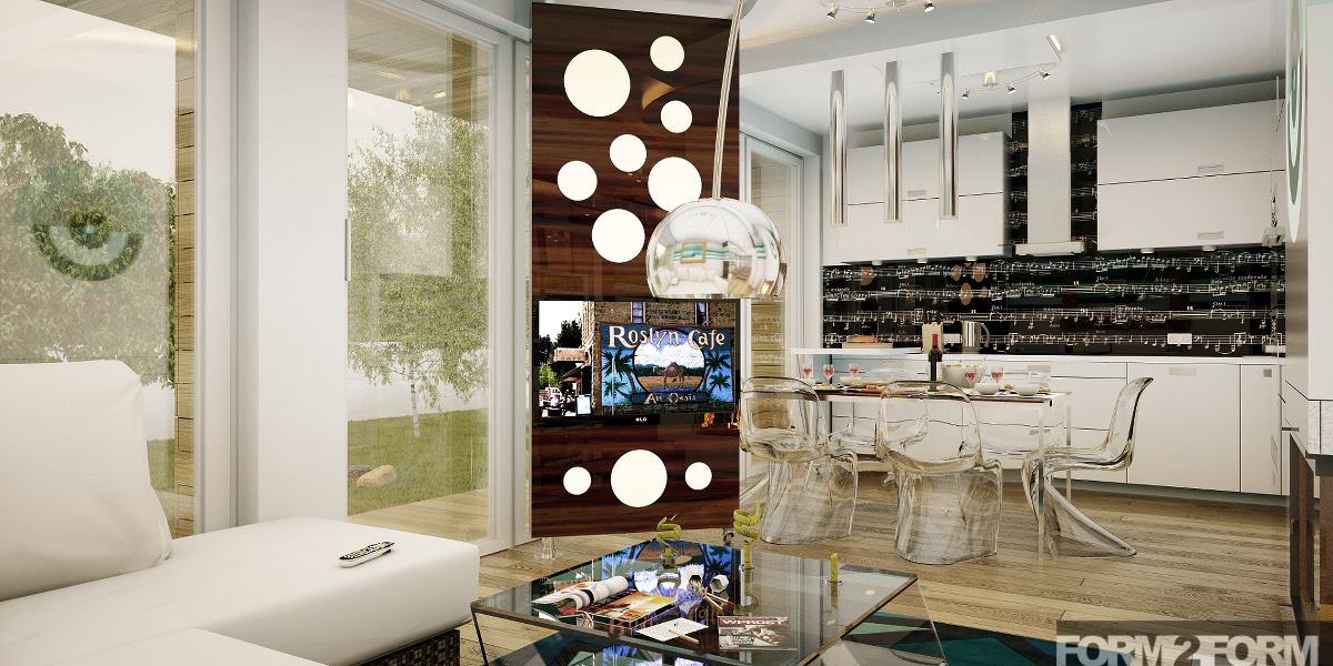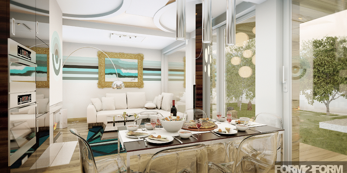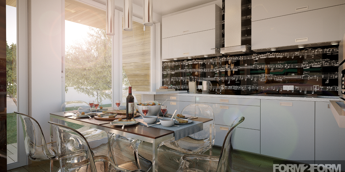 - lens flare like on first exterior image and in kitchen is added in gimp ( gimp has nice automatic: lens flare filter )