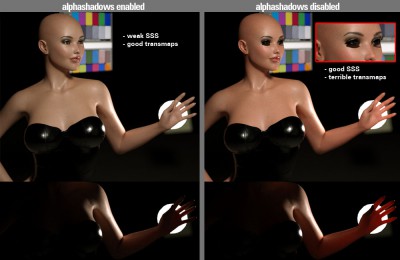Yes, I have tried that - and it does not give the same effect that I am getting with alphashadows disabled. There is something about the alphashadows enabled that deadens the SSS effect especially in the large volumes of the body.KleanZlate wrote:Have you tried setting Absorption and Scattering to 0 and Phase=Scattering Direction to 1?