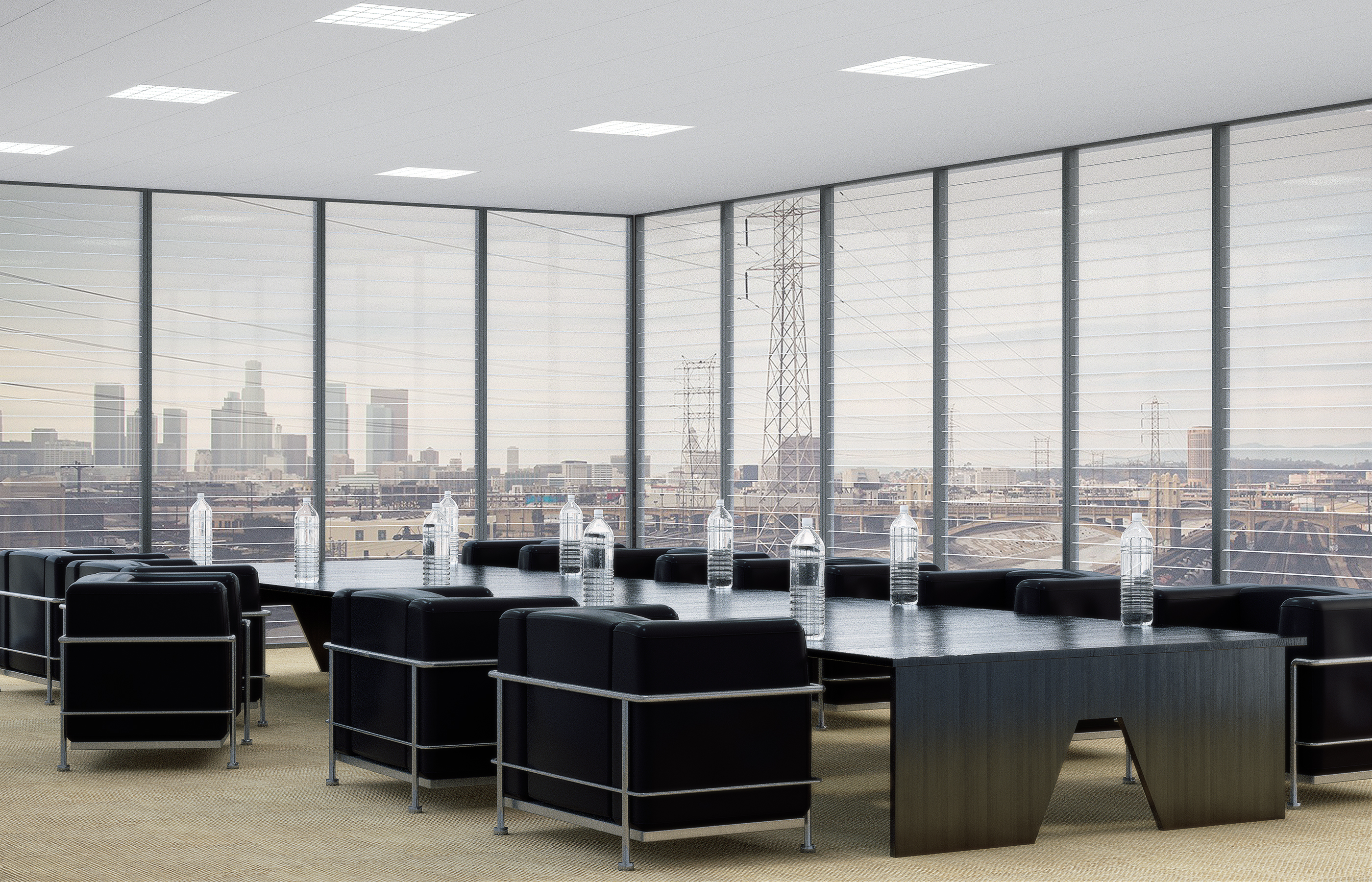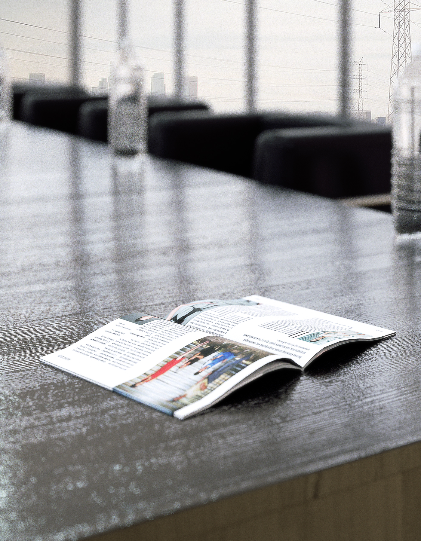 This is a composition comment: I would omit the bottles of water, they're too big and too many, and look very cheap. Put instead a tray with a glass bottle (a posh one like St. Pellegrino) and a set of glasses