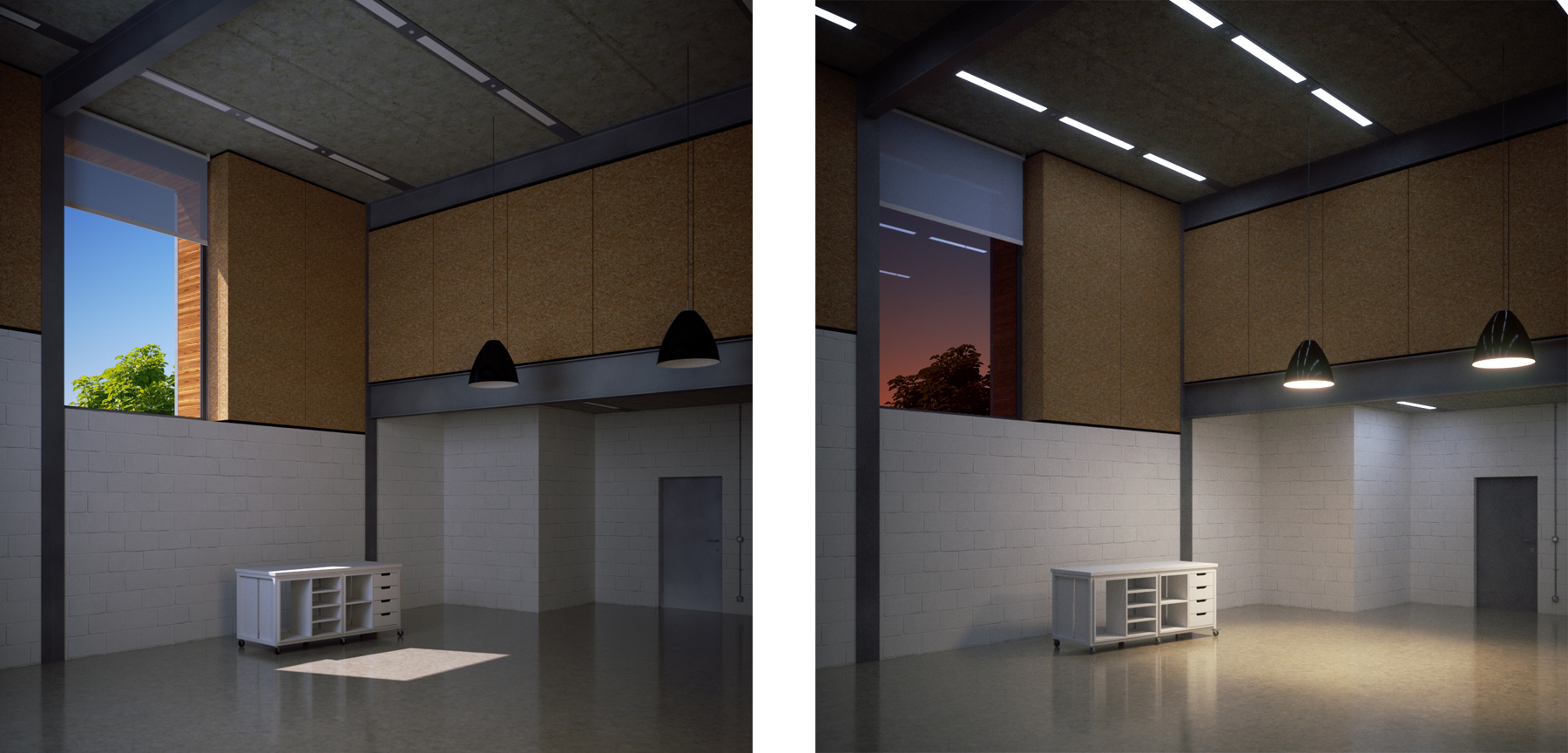Both images are of an unbuilt building, a maintenance facility that we've designed in the office. It's quite a drab building, but it has an interesting large window. I've done a set of renders focusing on this window.