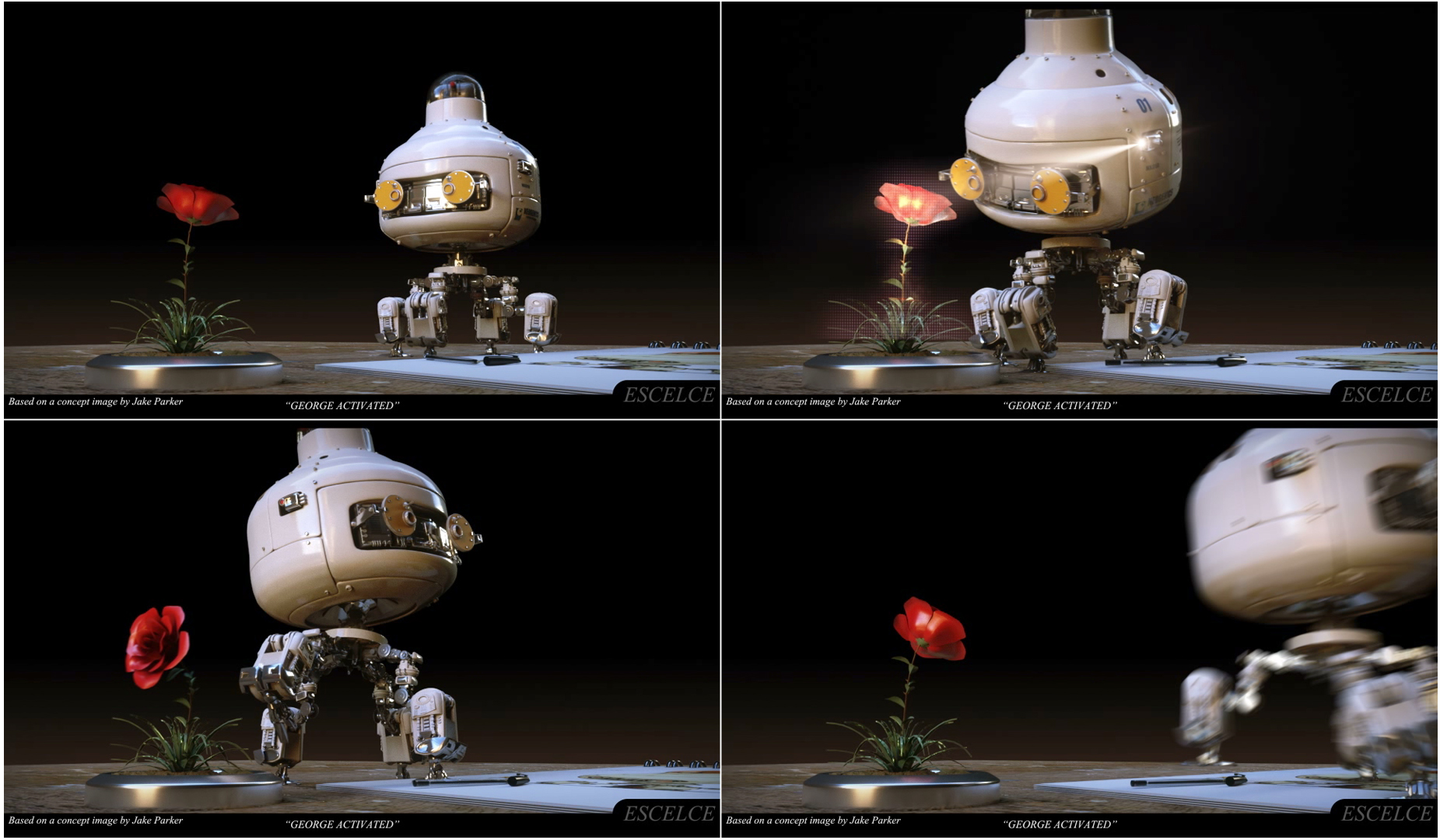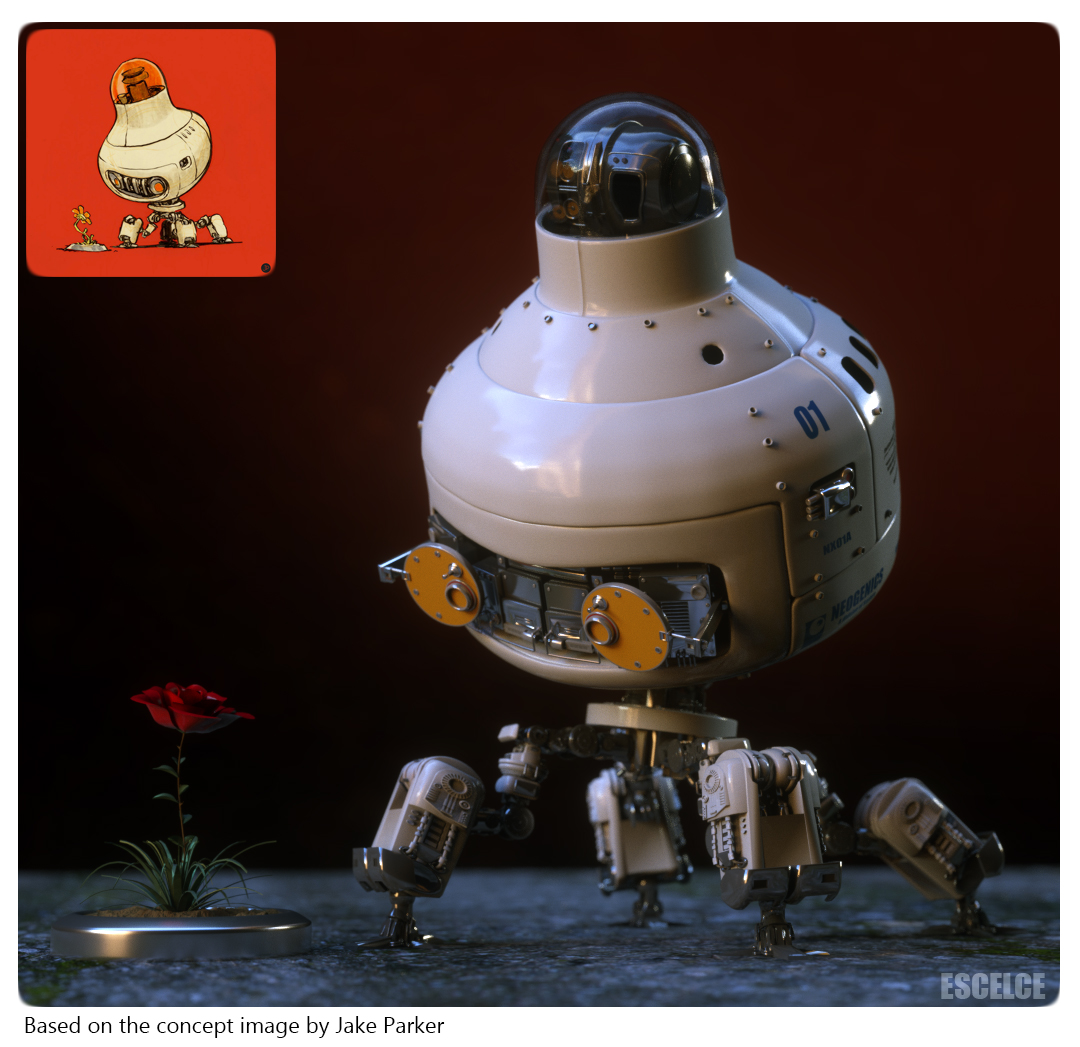 Top notch work on the robot. My only critique would be that the flower and metal ring could be improved. The concept had a flower with much more character. Try replacing the 'rose' with either a Marigold or a really exotic flower of your own design. The flower looks plastic at the moment and the ring is too high and/or could use more detail.