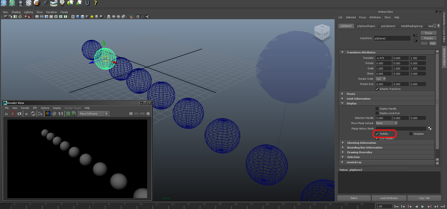 3. Hide the original sphere using the it's transform node, leaving it's shape node visible.