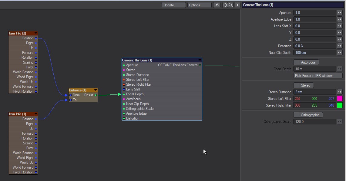 i need to have an animated depth of field effect for a project. Let's say there is an object and the focal point has to move through this object. I took a Null object and in the octane editor i tried to get its position to drive the focal depth input of the ThinLens camera with the ItemInfo Node. I made a quick animation of the Null through the object but there is no visible change of the dof effect. What am i making wrong?