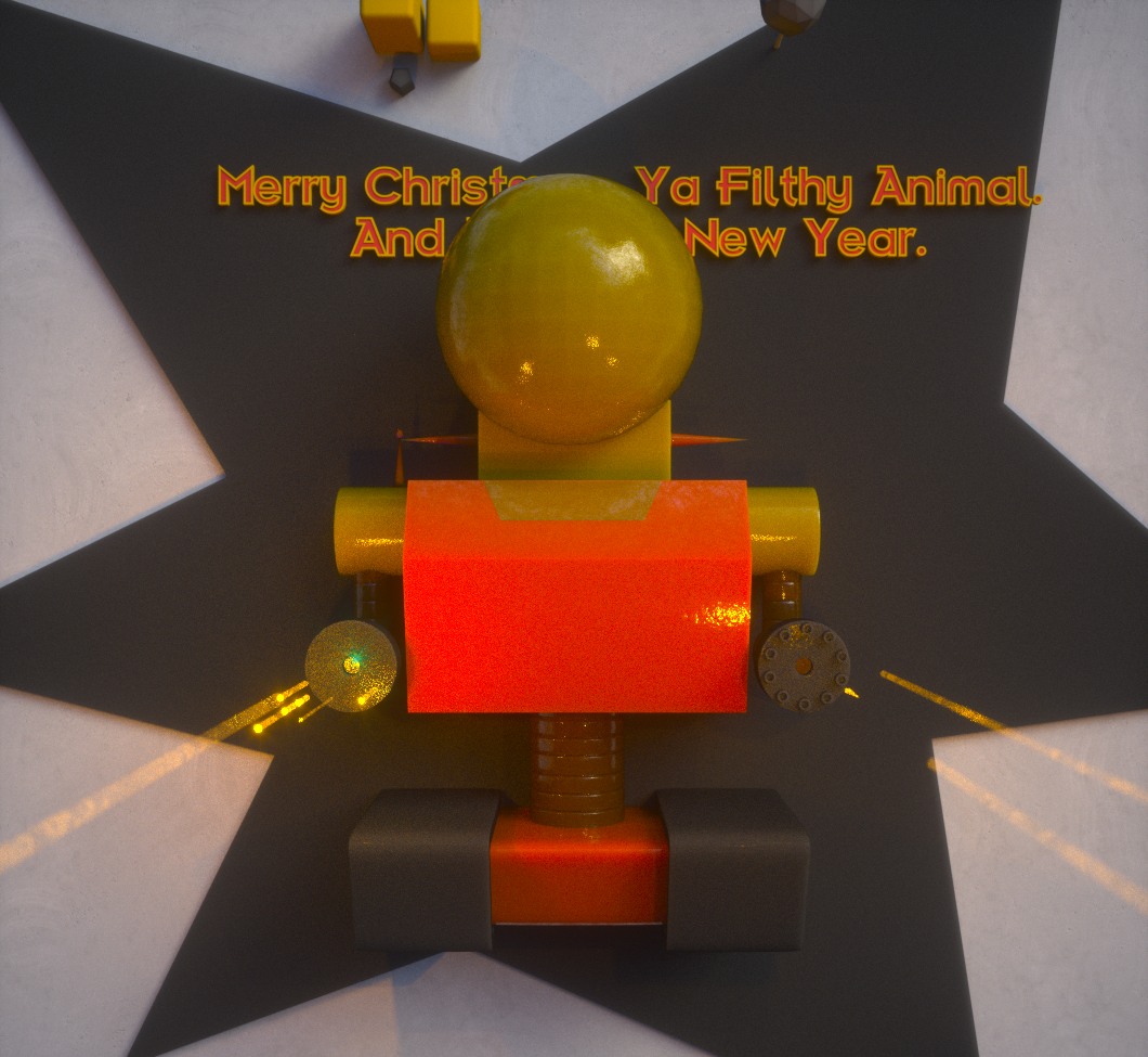 .. then turned off the external light so most of it comes from the laser/gattling guns as to get dramatic shadowing.. not enough light on SSS requires more fine tuning, so turned everything to glossy later.. now the first seems like the cleaner option.. always shuffling that lighting