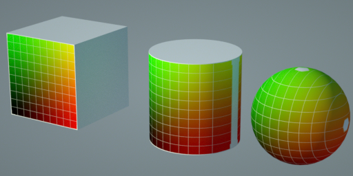 The cube, cylinder and sphere shown have a bounding box of (-1, -1, -1)–(1, 1, 1), and use object space coordinates.