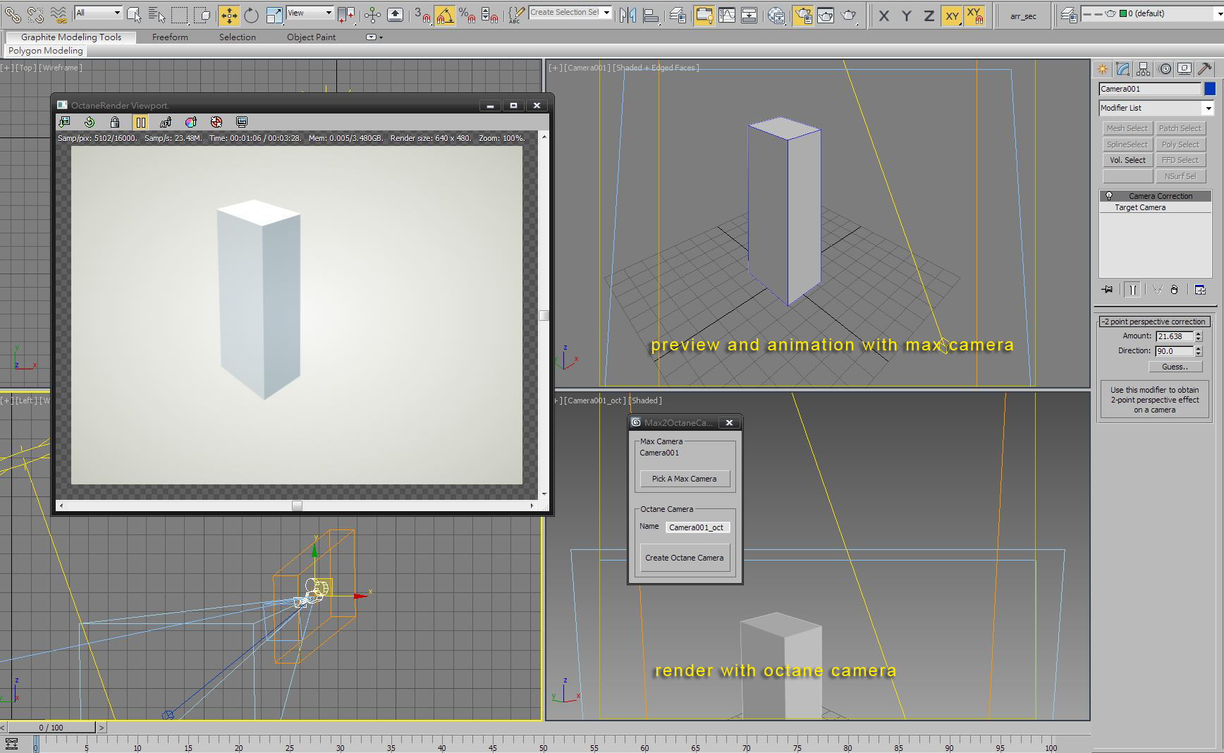 So you can preview camera correction and animate with standard max camera then render with the created octane camera.