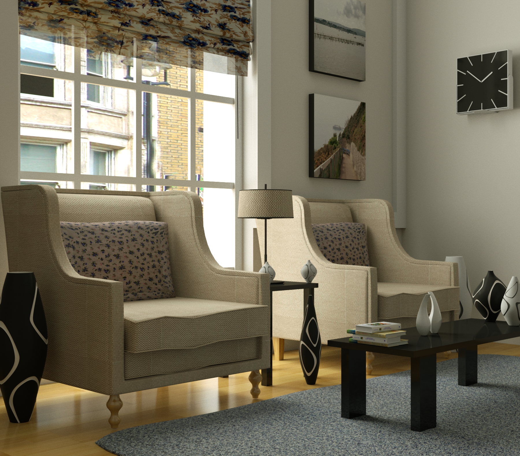 You should try to use hight poly objects: the couches (that are so visible) are too "hard" (the texture used is not good for tiling...even for the carpet, maybe an hairy carpet would be the best.