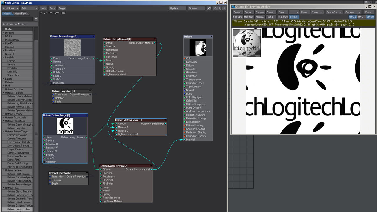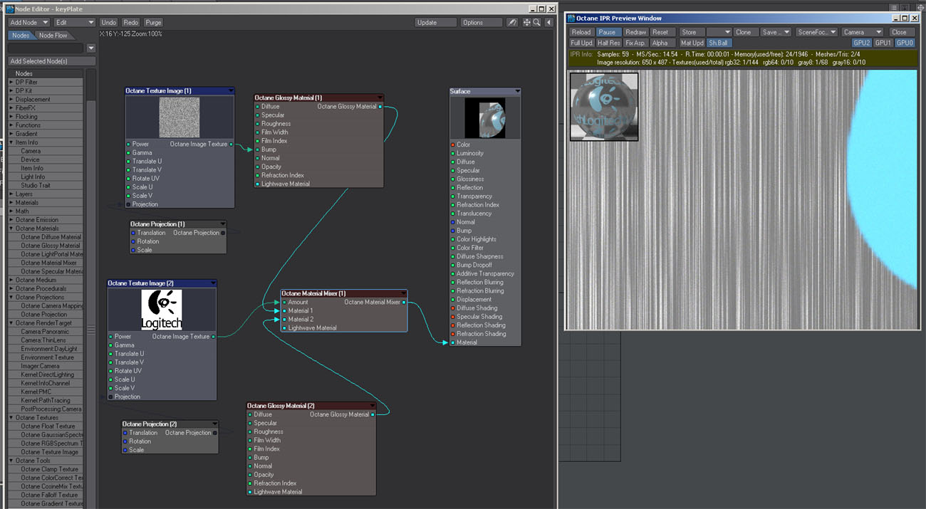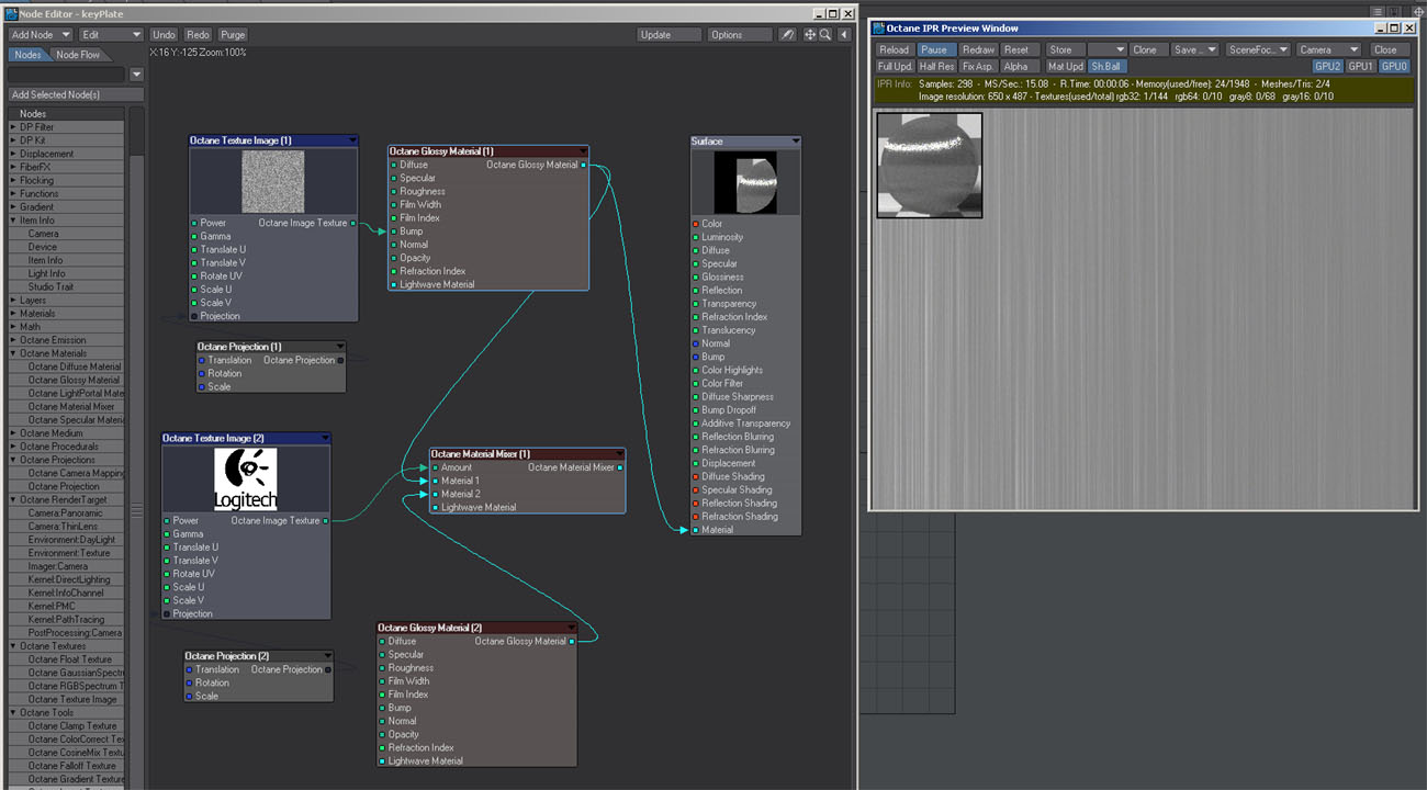 Now the issue I mentioned yesterday. Brushed surface and logo are mixed via image. Now the brushed surface is plugged directly into the surface node. Notice the brush scale and/or strength has changed.