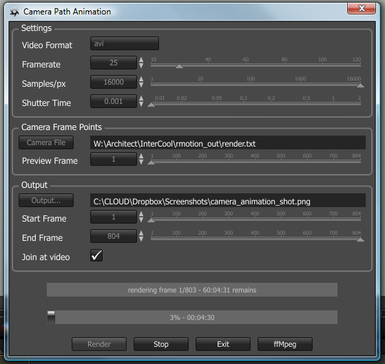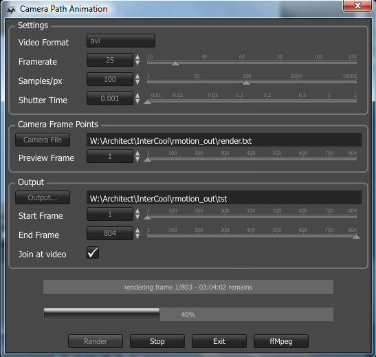 Here is a script that animates a camera from a camera-target position file. It uses ffmpeg for the video creation.
