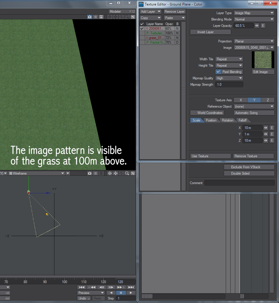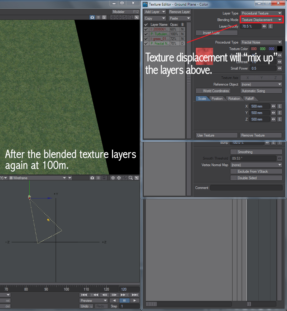 Obviously I didn't just tried the defaults and gave up, I played with the settings, scaled both textures and procedurals, rotated them, and tweaked lots of settings. While this method makes the pattern a little less noticeable, it's still evident. I want to achieve what this guy did with the texture displacement blending mode in Lightwave, is there a way to do that? If not, is there a way to surface a large object in which the textures won't look tiled? Think of it as what the Lightwave instance generator does in surface and random mode, where it scatters the instanced object all over the place and you can set a min and max scale, offset, rotation, etc. I'm looking for a way to do that, but with a texture or two, because if I just use instanced grass over the whole surface I need the grass on, it takes 6 minutes to load into the GPU, and about the same time to render without too much noise.