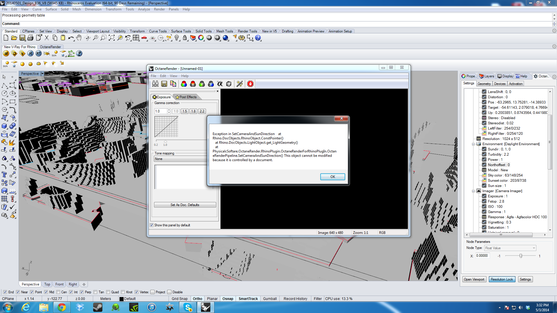 I installed OctaneRender for Rhino 5.0 today, and all was going well until the error appeared when I clicked the render bar. It happens in both 'open viewport' and 'render' mode. There is no info on this so I have come here to hopefully find some answers. I am currently working on a few designs so would be good if I could knock this error on the head.