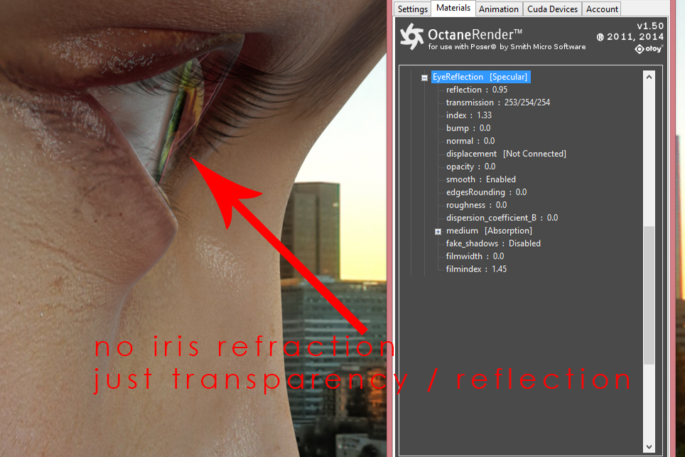 This is where the problem comes in: All DAZ figures are using an "eye surface" or "eye reflection" material that is coplanar meaning, that it is not suitable for realistic refraction calculation, since it has no volume and light travels only through the surface but not the volume