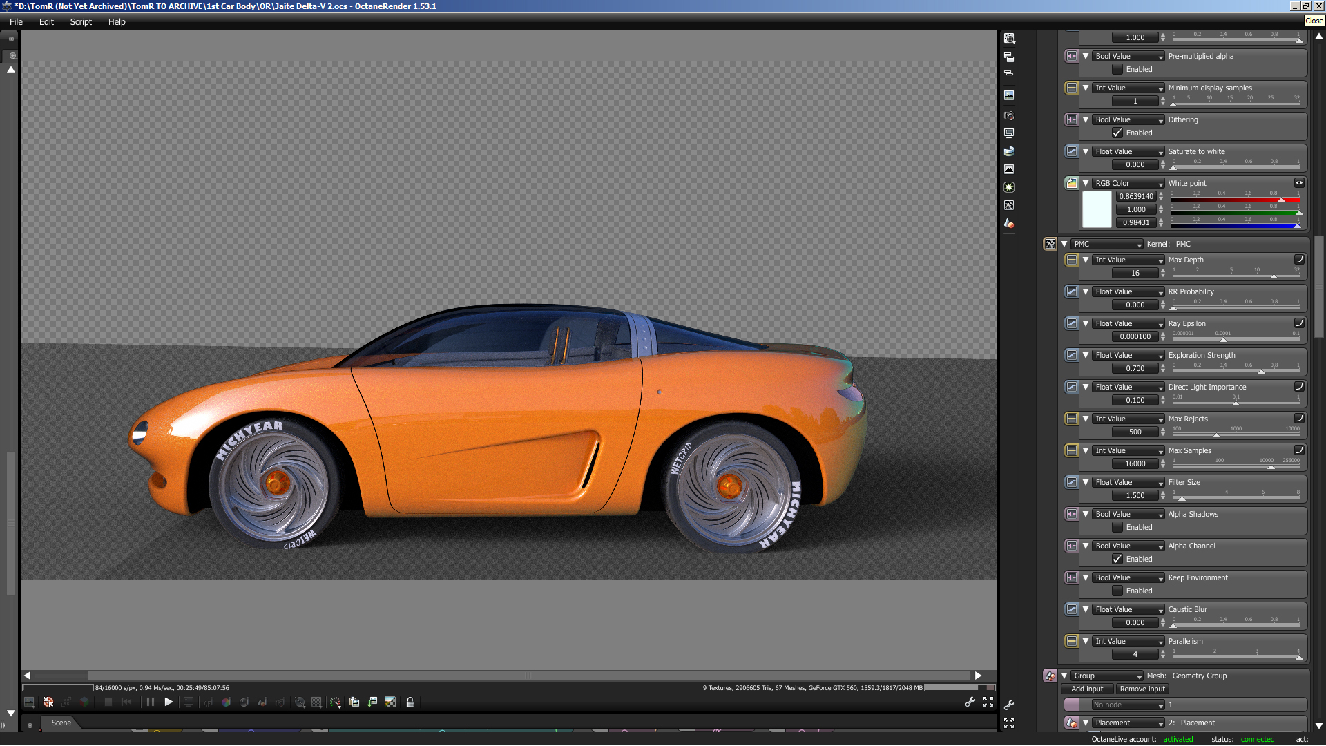 Win7 | Geforce TitanX w/ 12Gb | Geforce GTX-560 w/ 2Gb | 6-Core 3.5GHz | 32Gb | Cinema4D w RipTide Importer and OctaneExporter Plugs.