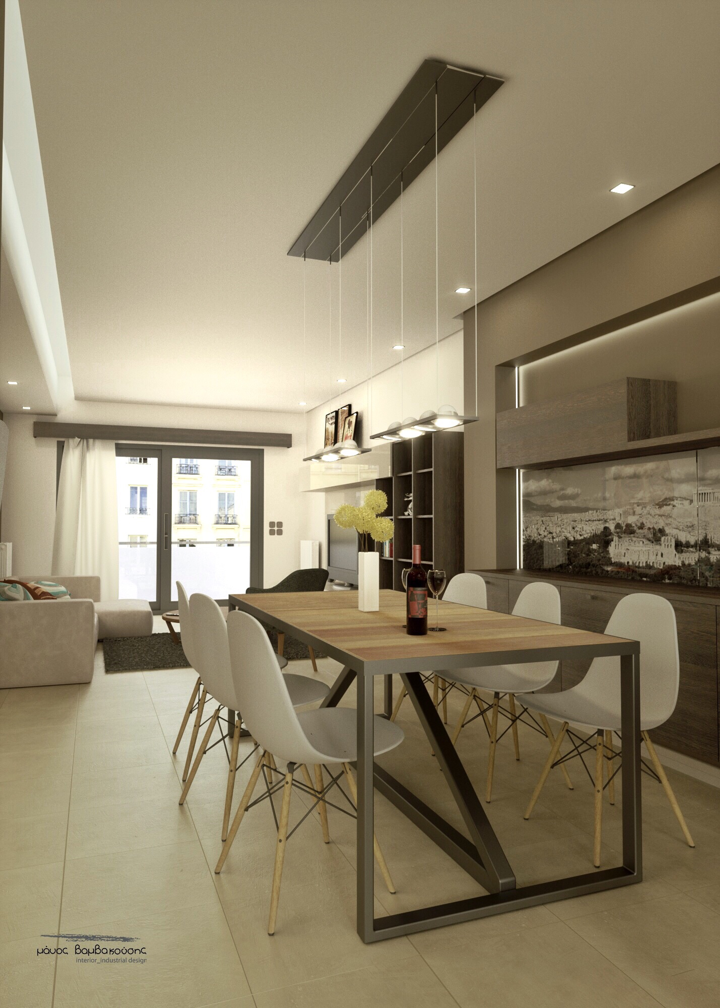 Living room, dining table and kitchen.