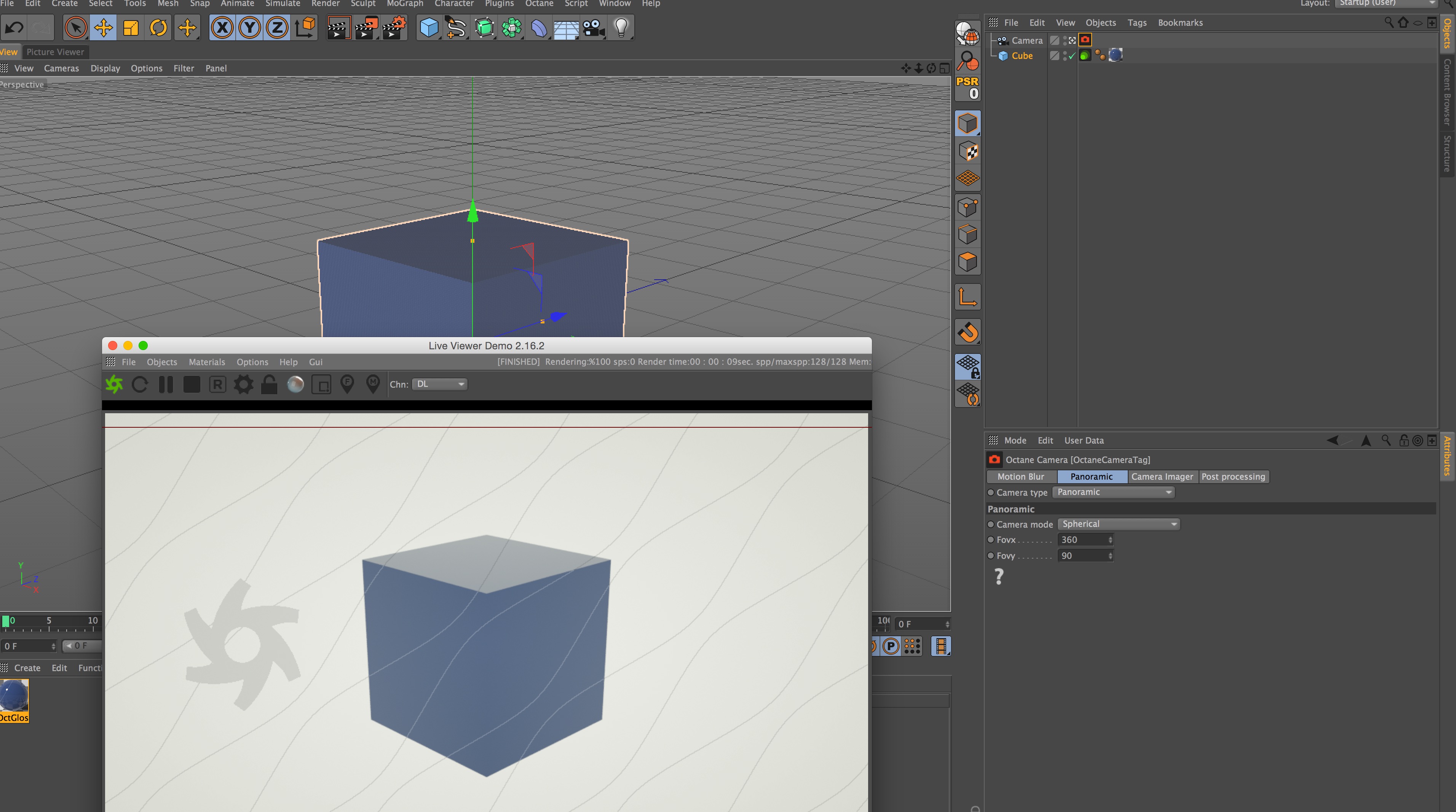 and it explains how easily the user can switch between the Thin Lens and Panoramic cameras. When I switch between the two in the Octane camera tag and adjust the fov settings in the Panorama section I see no immediate impact on the rendered image.