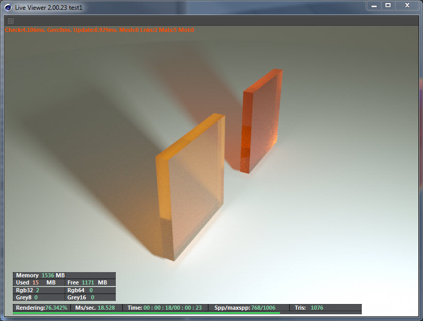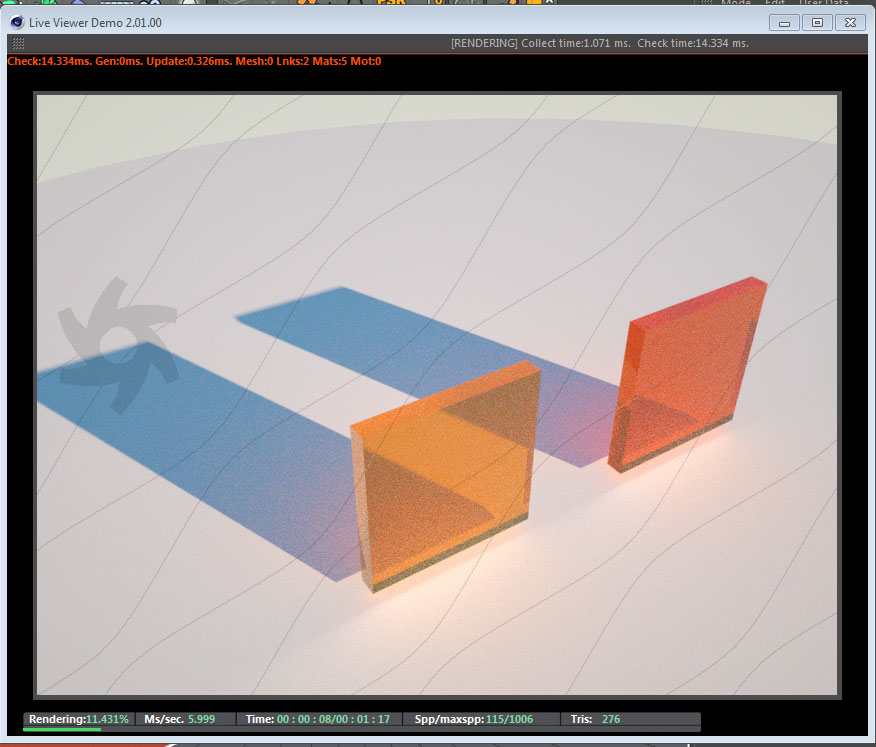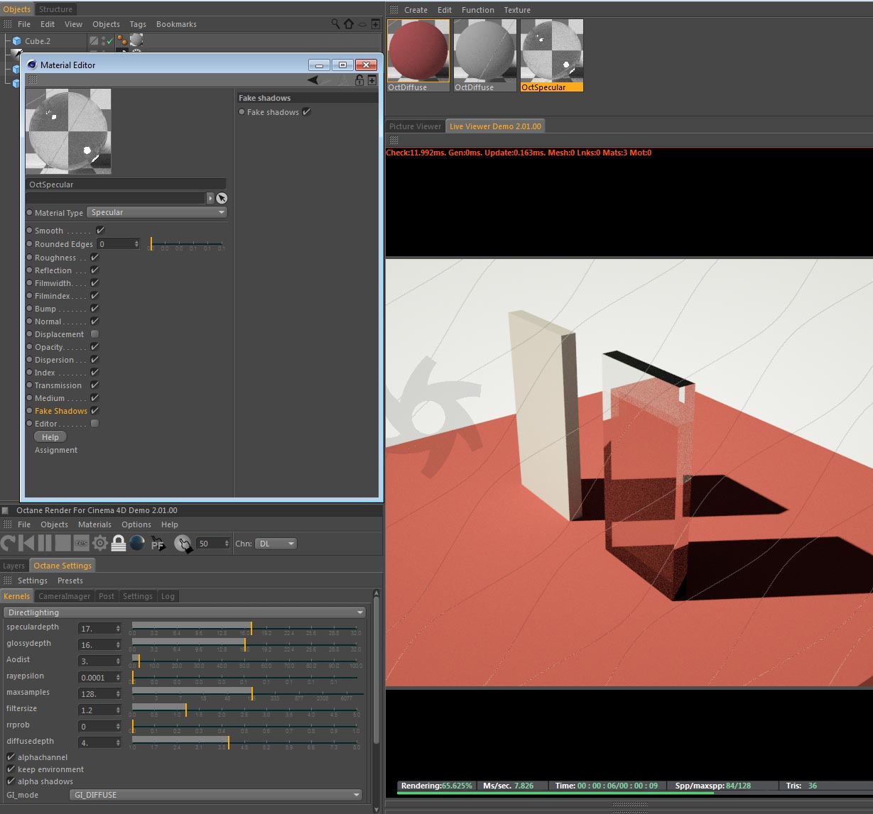 I am having a problem with specular material shadows behaving as if the object is solid. As you can see in the attachment, both fake shadows and alpha shadows are enabled. The problem persists in all kernels. Is this a limitation in the demo, a bug, or am I just missing something?