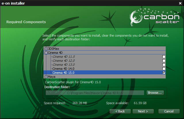 Thanks for the response. I just bought Carbon Scatter, so I downloaded it (version 2.0 build 2103892) from the link they sent me last night. I installed the Cinema 4D R15 version. You are right - there is an update to the one I have - 2103901. I will try it to see if that fixes it.