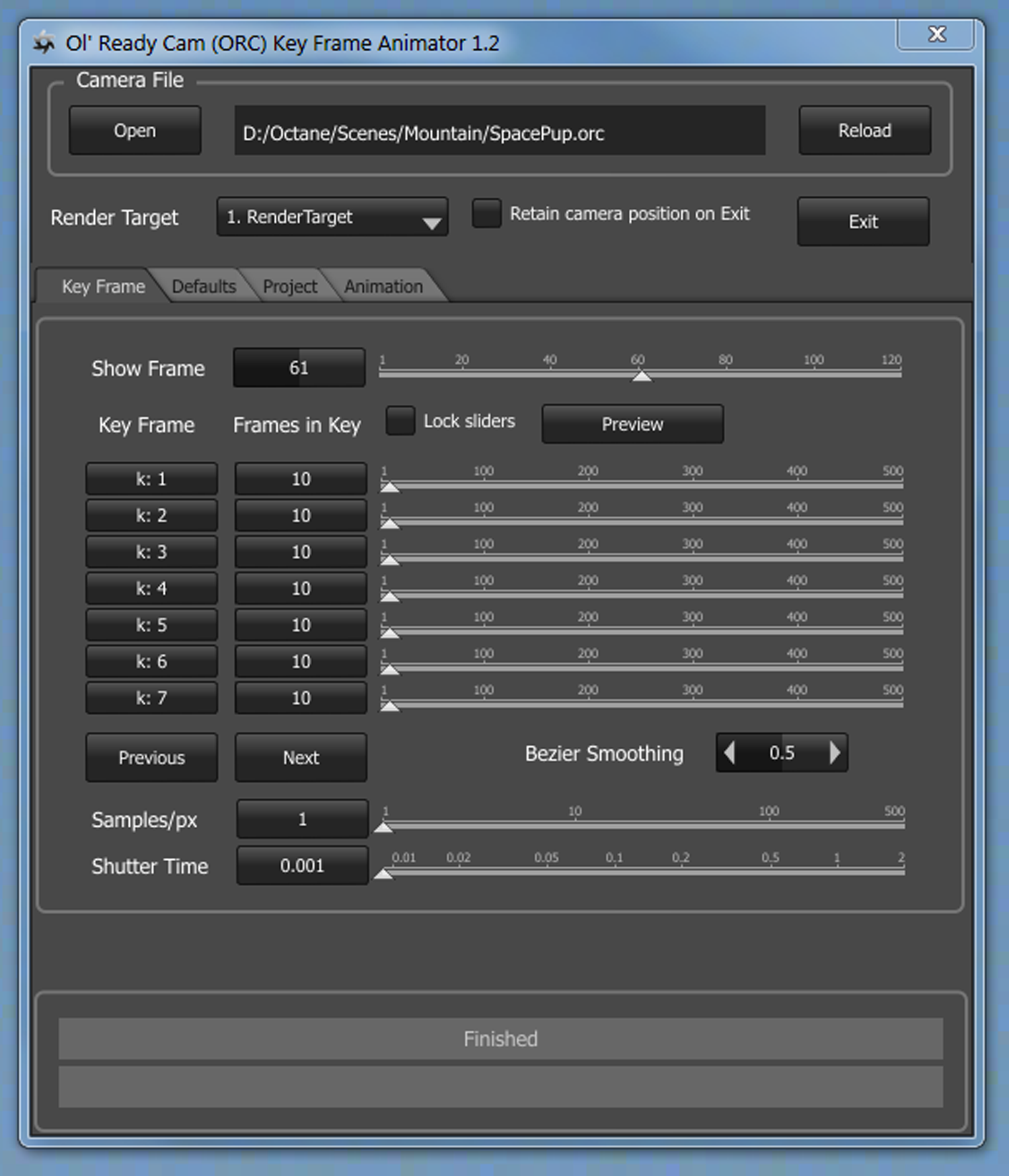 * The number one rule in adding a key frame is to first select a Render Target node if more than one is present and especially if multiple cameras are being used. ORC will warn you if this condition exists and tell you which one it will use. This however, may not correspond to the current camera view meaning that every frame you add will be for the exact same position from the camera to which ORC defaulted.