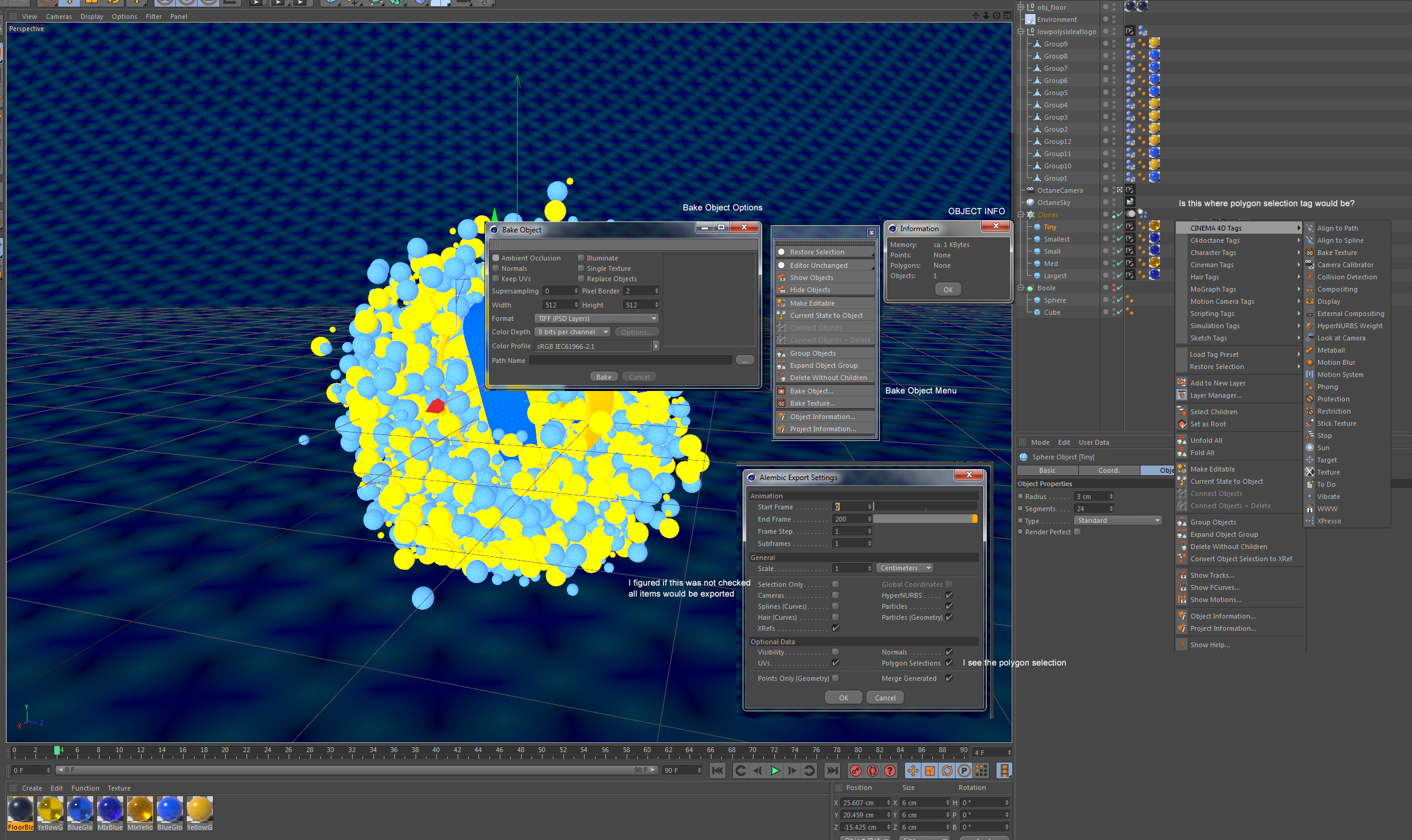Am I right in assuming that as long as the poly spheres are under a "cloner" they lose their polygon properties and you have so tag them again? How do you tag them as a poly selection?