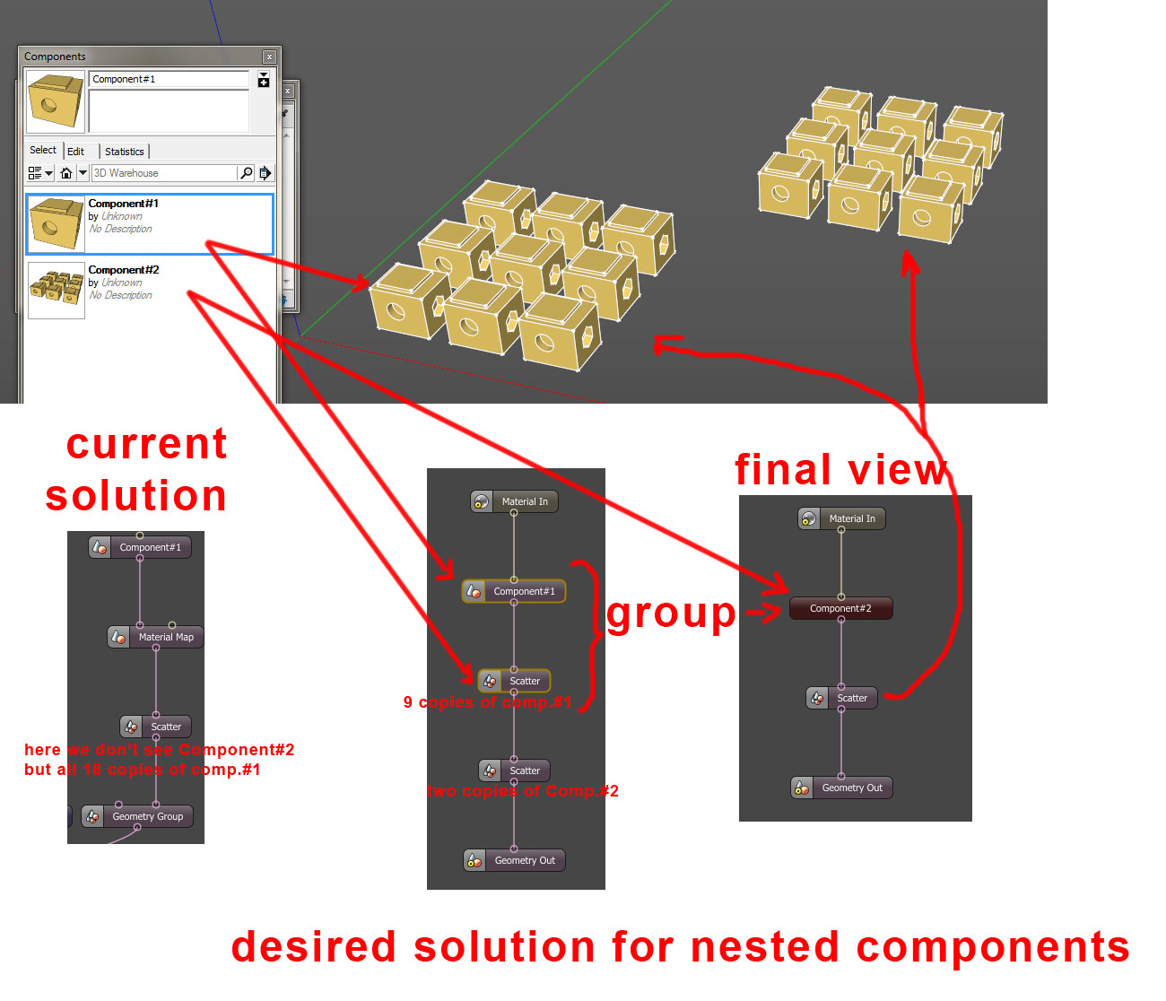 4. Components that contain other components should be grouped and then scattered. Shortly speaking scatter nodes should not include information about components that are outside other components or groups. This is the key to introduce the same order as in Sketchup. IMO this is the most important feature that ocs exporter should have.