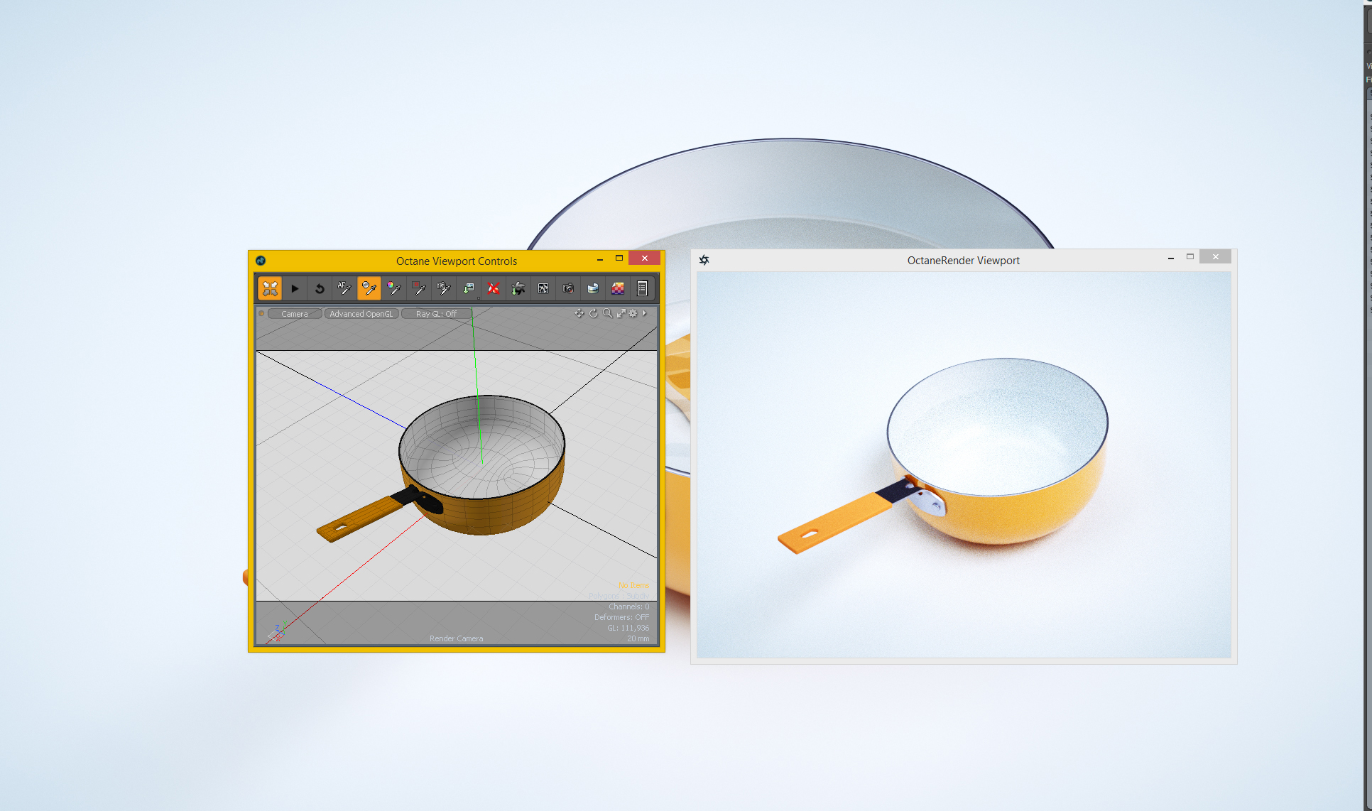 I think it will work for 1 monitor too, or for small monitor the modo viewport window can be deleted, and having the octane render window over will work, in modo we can expand the viewport, with 0 on numpad, or hitting the maximize icon on the interface.