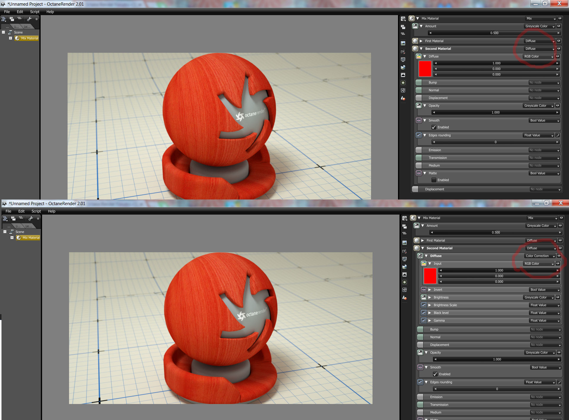 I've used the mix material with color correction node on 2nd material, but I get the same result as if I just mixed them with an RGB color, and my woods end up loosing much of its grain/texture in favor of the plain color..