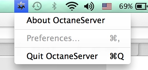 - After starting OctaneServer - you will have the clickable Octane icon in the Status Bar, showing the server is running. To stop the server - just open the menu by clicking the Octane icon in the Status Bar, and choose "Quit OctaneServer".